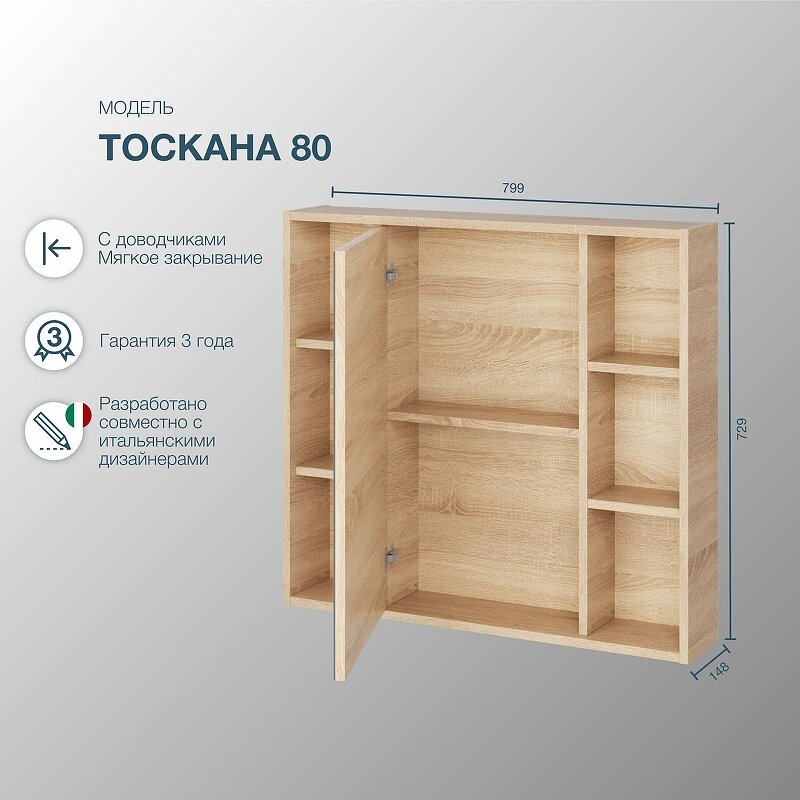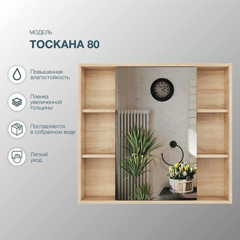 Зеркало-шкаф Sanstar Тоскана 80 дуб сонома светлый не только не только функциональный предмет интерьера ванной комнаты, но восхитительное эргономичное дополнение дизайна, как небольшого, так и крупного помещения.