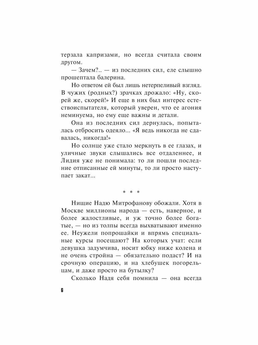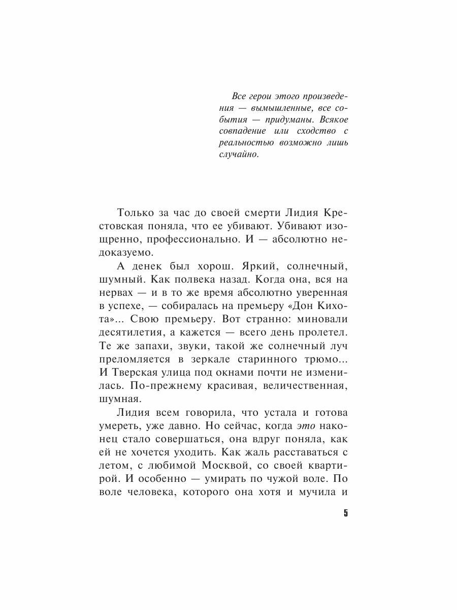 Надя Митрофанова не смогла пройти мимо старушки, которой стало плохо с сердцем на улице. Так она оказалась в квартире известнейшей балерины Лидии Крестовской. Вот только слава, положение, внимание властей и прессы остались в далеком прошлом - Надя увидела одинокую пожилую женщину, вынужденную во всем полагаться на своего домоправителя Егора. Когда балерина ушла из жизни и ее тело тайно кремировали, выяснилось, что все имущество Крестовской принадлежит Егору. Но своей ли смертью умерла легенда эпохи? Анна и Сергей Литвиновы - уникальный литературный тандем, мастера остросюжетного жанра. С первой же книги они завоевали сердца читателей. С 1998 года вышло более 80 романов и 7 сборников рассказов суммарным тиражом более 10 миллионов экземпляров. Снято множество экранизаций романов Литвиновых - «Авантюристка», «Частный сыск полковника в отставке», «Спецкор отдела расследований», «Одна жизнь на двоих» и другие.