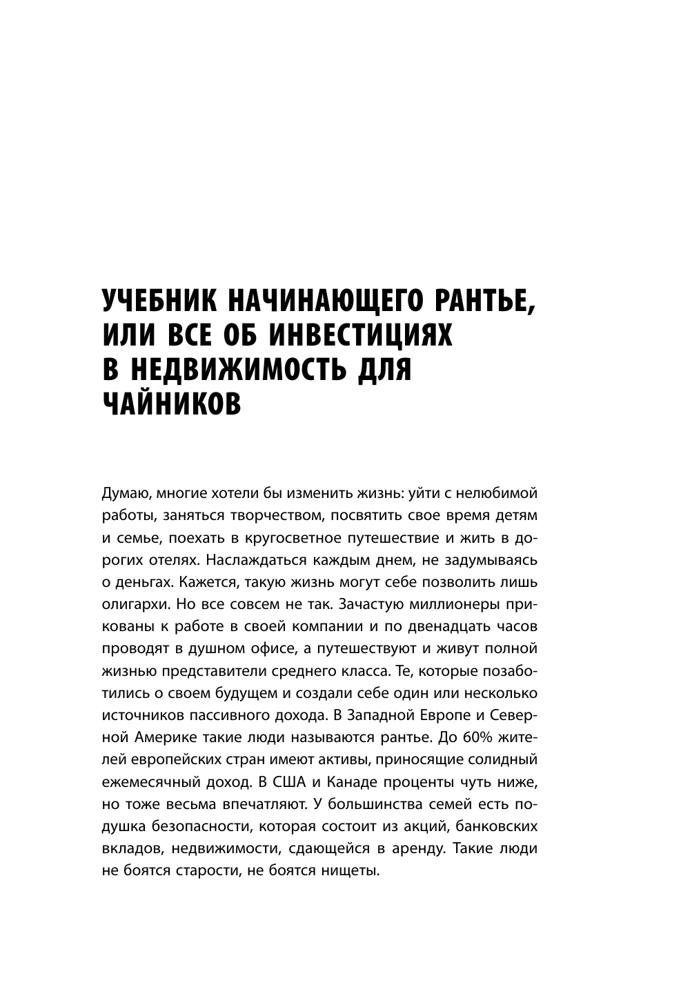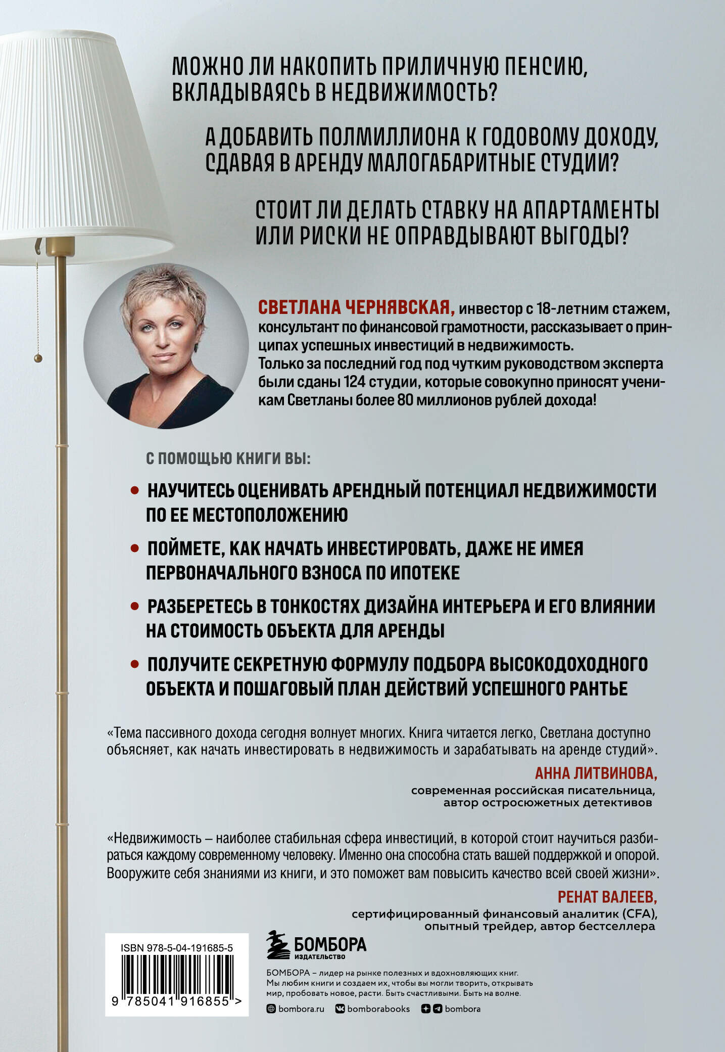 Можно ли накопить приличную пенсию, вкладываясь в недвижимость? А добавить полмиллиона к годовому доходу, просто покупая, ремонтируя и перепродавая квартиры? Стоит ли делать ставку на апартаменты или риски не оправдывают выгоды? В своей книге Светлана Чернявская, инвестор с 18-летним стажем, консультант по финансовой грамотности Минфина РФ, рассказывает о принципах успешных инвестиций в недвижимость. Только за последний год под чутким руководством эксперта были сданы 124 студии, которые совокупно приносят ученикам Светланы более 80 миллионов рублей дохода! С помощью книги вы: - научитесь оценивать арендный потенциал недвижимости по ее местоположению; - поймете, как начать инвестировать, даже не имея первоначального взноса по ипотеке; - разберетесь в тонкостях дизайна интерьера и его влиянии на стоимость объекта для аренды; - получите секретную формулу подбора высокодоходного объекта и пошаговый план действий успешного рантье.