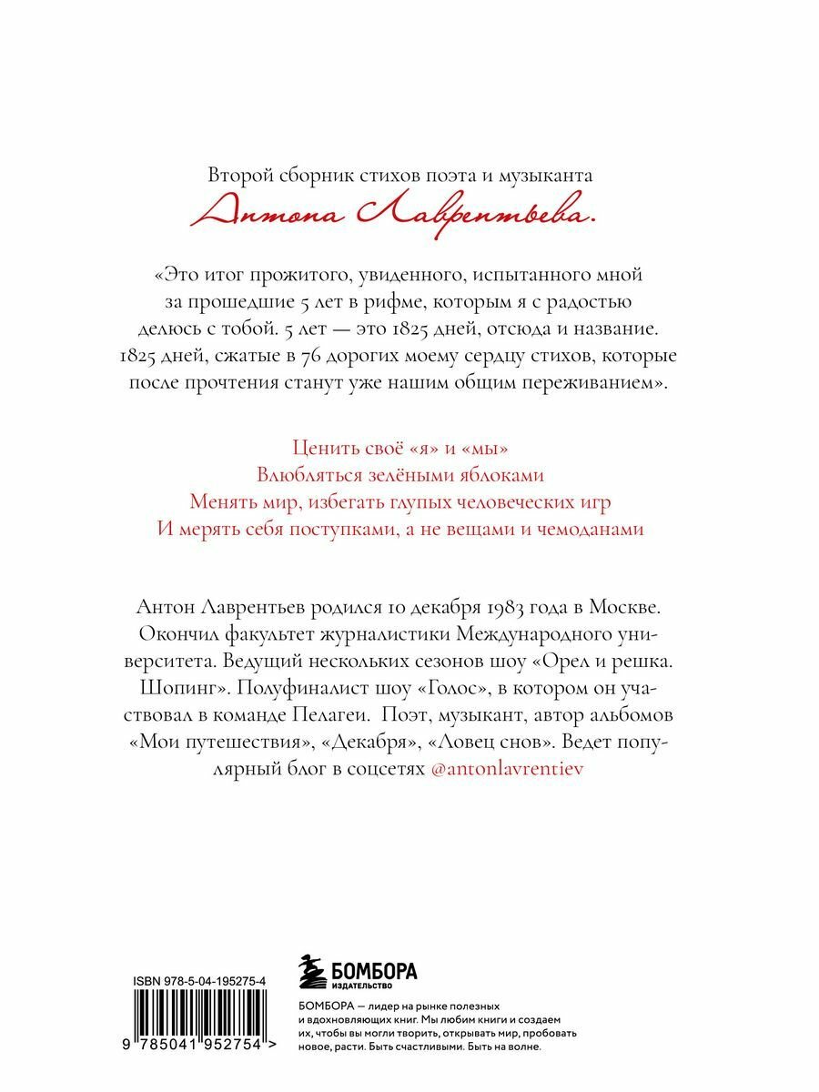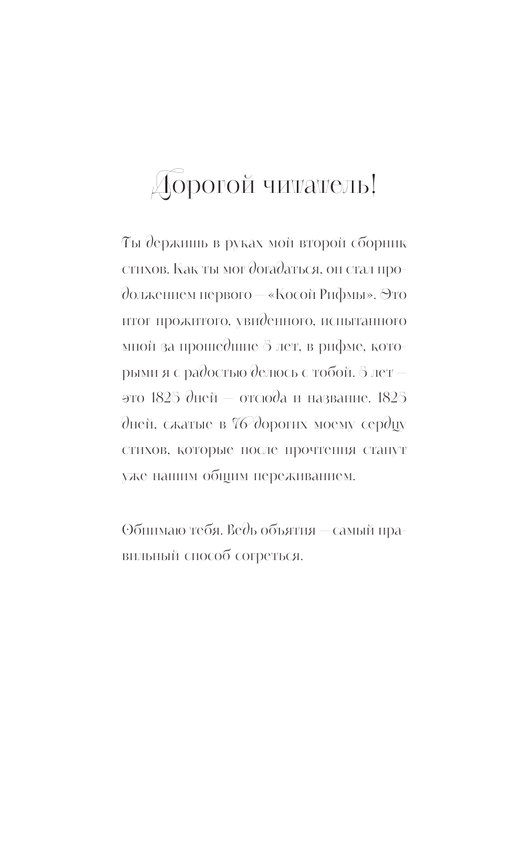 «Дорогой читатель! Это мой второй сборник стихов. Как ты мог догадаться, он стал продолжением первого — "Косой Рифмы". Это итог прожитого, увиденного, испытанного мной за прошедшие 5 лет, в рифме, которыми я с радостью делюсь с тобой. 5 лет — это 1825 дней, — отсюда и название. 1825 дней, сжатые в 76 дорогих моему сердцу стихов, которые после прочтения станут уже нашим общим переживанием.