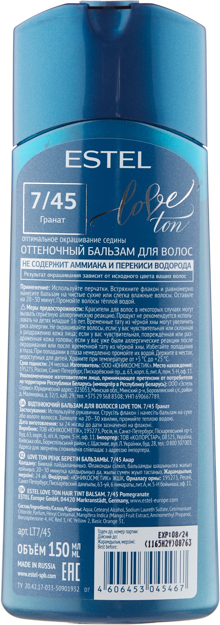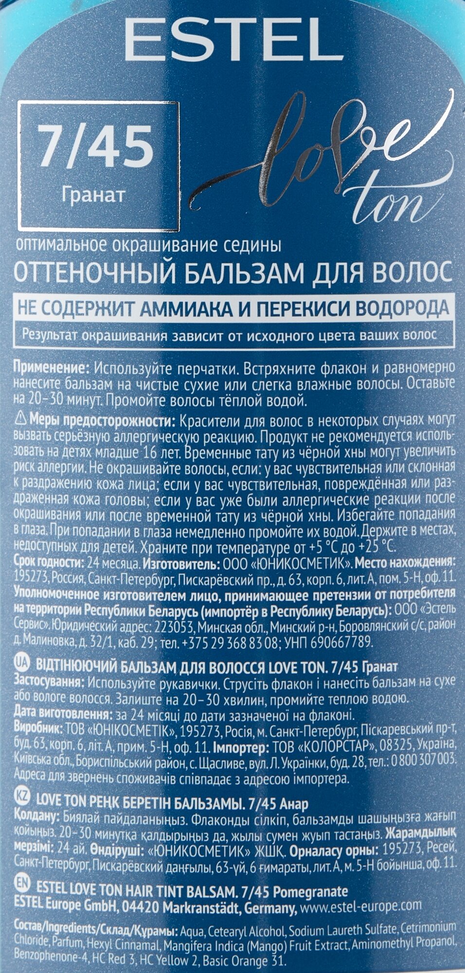 Оттеночный бальзам для волос Estel "Love Ton" - это высококачественное средство, позволяющее освежить шевелюру, придать ей блеск к мероприятию и удивить окружающих, а спустя неделю вернуться к привычному образу. Средство обеспечивает мягкий уход за шевелюрой. В его безаммиачном составе отсутствует перекись водорода. Препарат влияет исключительно на верхний слой и постепенно смывается, примерно через 7-9 сеансов мытья. Бальзам с легкостью обеспечивает равномерное нанесение, кондиционирует, делает волосы живыми, мягкими и блестящими. Следует отметить, что Estel "Love Ton" является одним из самых популярных средств, представленных на рынке косметики для волос. Он соответствует всем мировым стандартам качества.