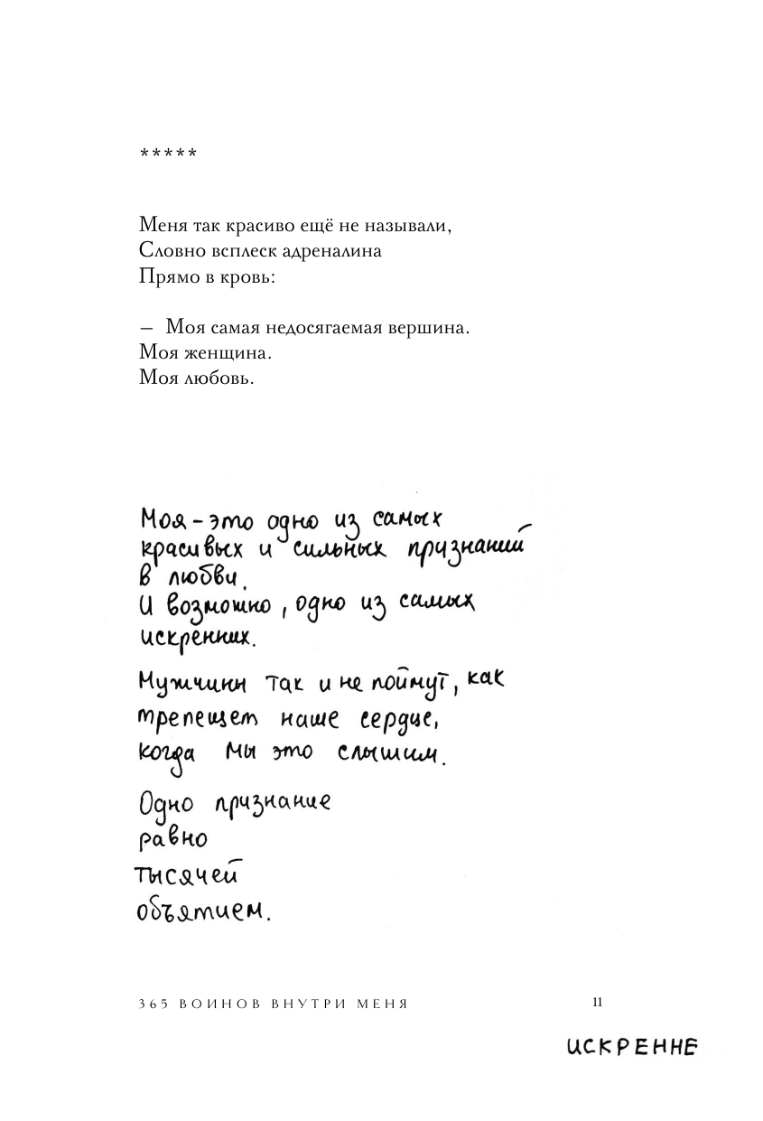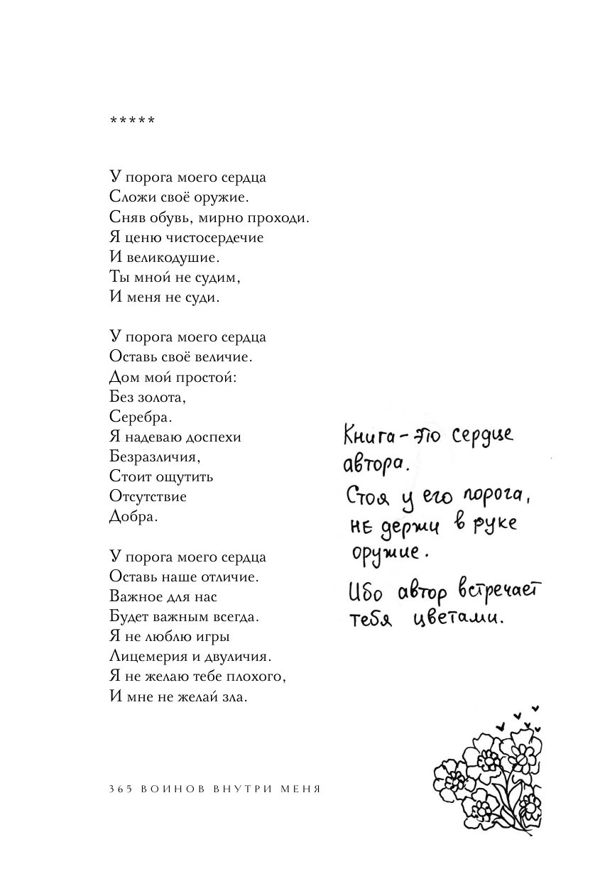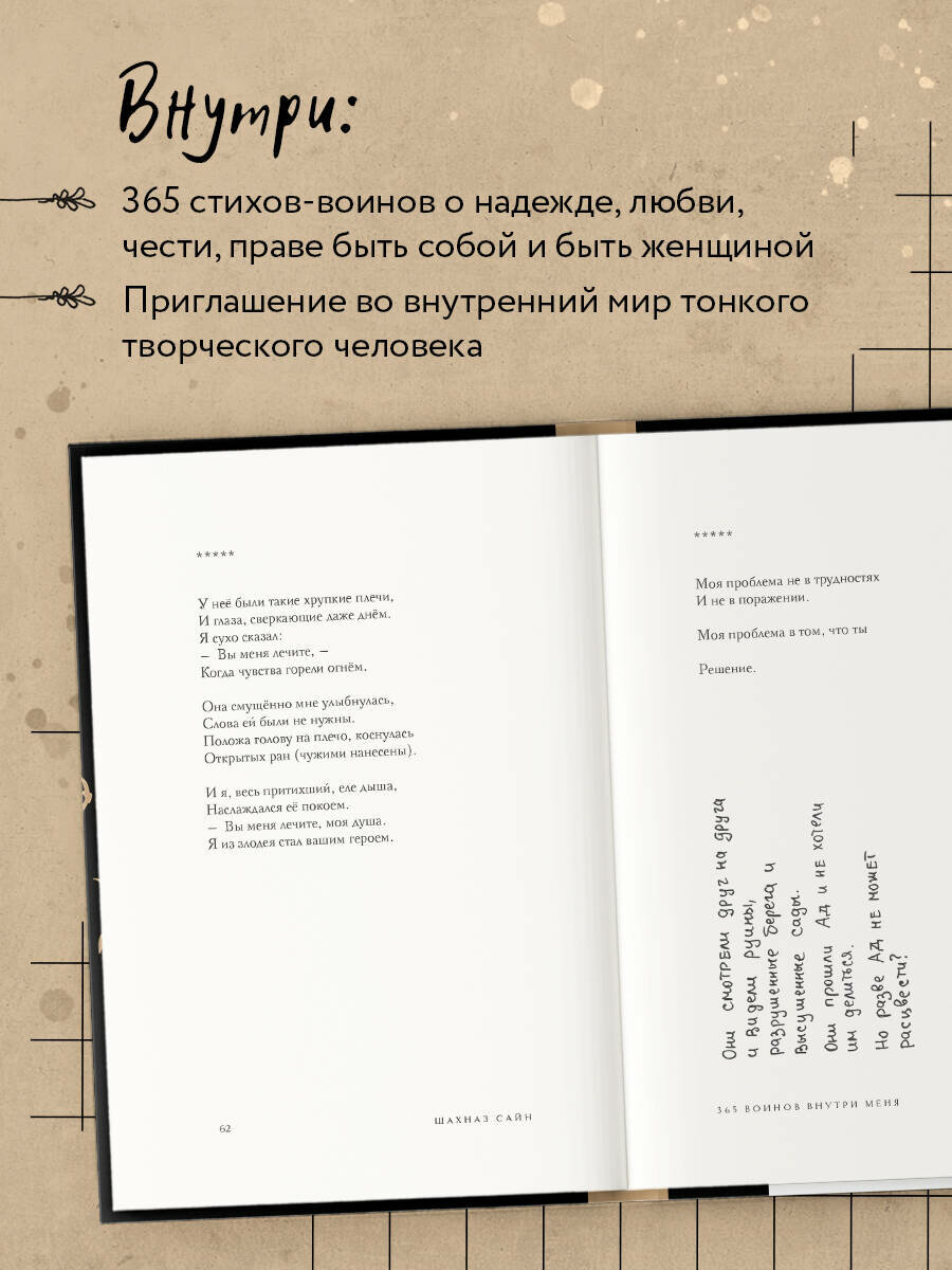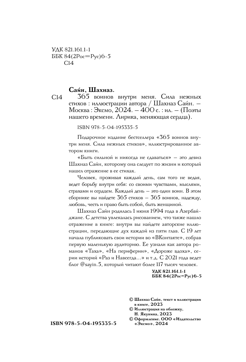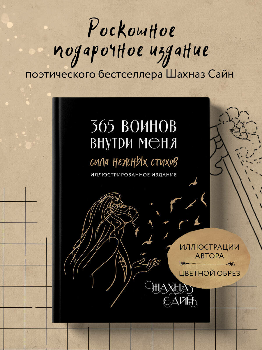 Уникальное и очень личное издание бестселлера «365 воинов внутри меня». Шахназ украсила его своими иллюстрациями и добавила небольшие вдохновляющие послания читателям. Все подписи и рисунки были сделаны автором вручную и бережно перенесены дизайнером на страницы книги. «365 воинов внутри меня» - это сборник молодой поэтессы Шахназ Сайн. Она начала опубликовать свои истории во «ВКонтакте» с 19 лет, собрав первую маленькую аудиторию. Позже ее узнали как автора тонких лирических романов «Таха», «На периферии», «Дороже вдоха», серии историй «Раз и Навсегда. », а ее стихи легли в основу многих песен, в том числе Миши Марвина. С 2021 года поэтесса ведет блог, который читают более 117 тысяч человек. Книга Шахназ состоит из 365 стихов и цитат, объединенных в пять глав: - О любви - Откровение - Голос - Женщина-воин - О важном Человек, проживая каждый день, сам того не ведая, ведет борьбу внутри себя: со своими чувствами, мыслями, страхами и сердцем. Каждый день - это один воин. Его состояние, сила и слабость, которые они проживают вместе. Каждый день - это воин, который позволяет человеку сделать выбор: идти дальше или стоять на месте. Ибо каждый воин - это урок, который человек обязан пройти.