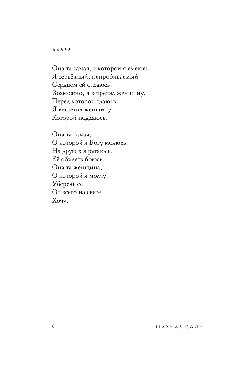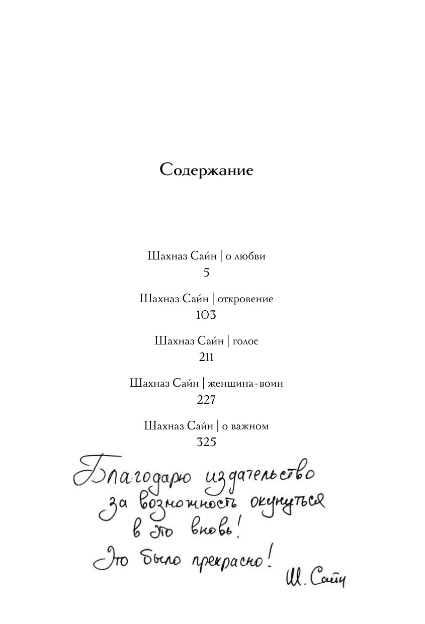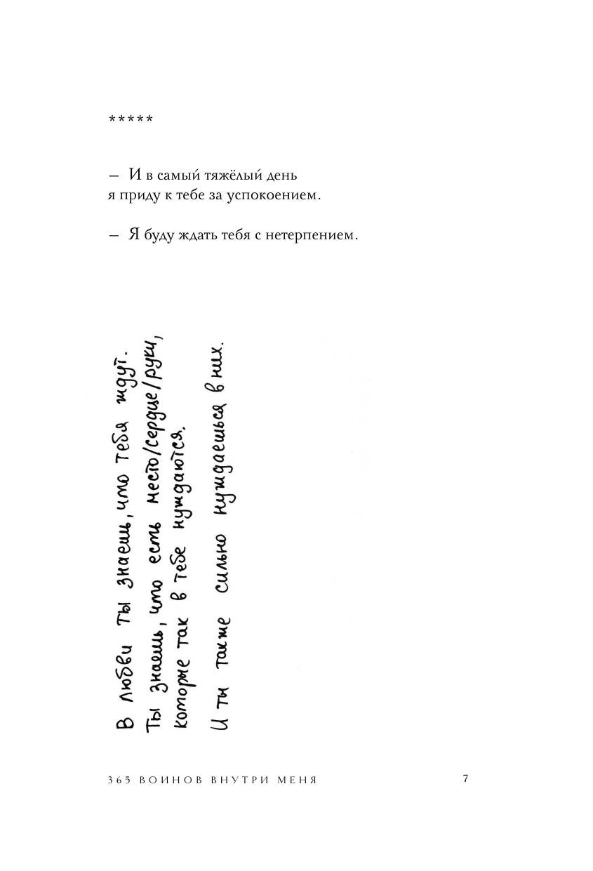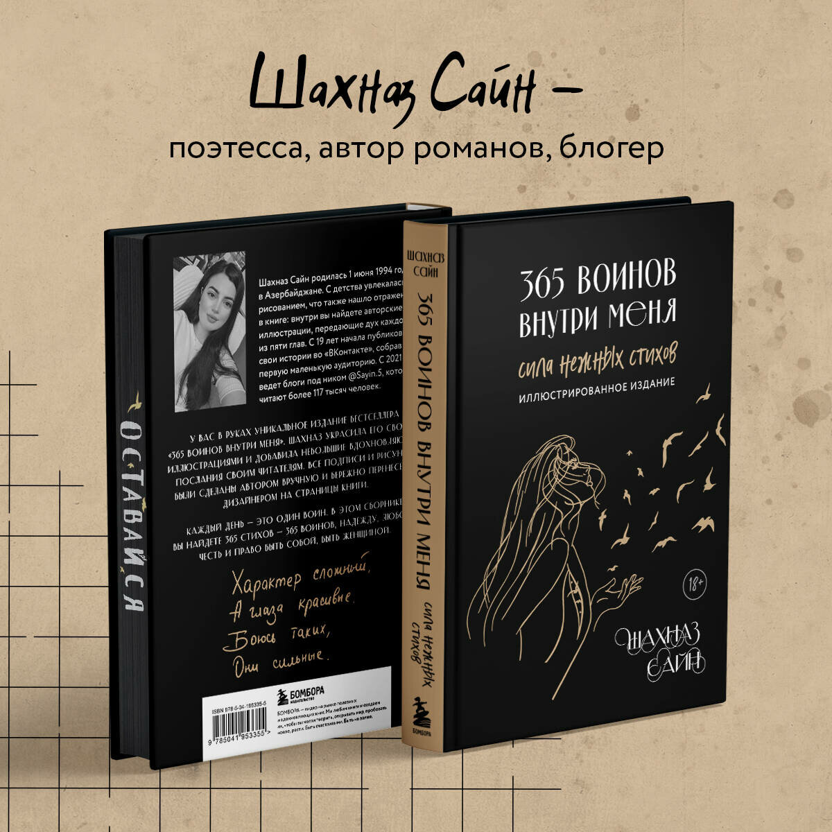 Уникальное и очень личное издание бестселлера «365 воинов внутри меня». Шахназ украсила его своими иллюстрациями и добавила небольшие вдохновляющие послания читателям. Все подписи и рисунки были сделаны автором вручную и бережно перенесены дизайнером на страницы книги. «365 воинов внутри меня» - это сборник молодой поэтессы Шахназ Сайн. Она начала опубликовать свои истории во «ВКонтакте» с 19 лет, собрав первую маленькую аудиторию. Позже ее узнали как автора тонких лирических романов «Таха», «На периферии», «Дороже вдоха», серии историй «Раз и Навсегда. », а ее стихи легли в основу многих песен, в том числе Миши Марвина. С 2021 года поэтесса ведет блог, который читают более 117 тысяч человек. Книга Шахназ состоит из 365 стихов и цитат, объединенных в пять глав: - О любви - Откровение - Голос - Женщина-воин - О важном Человек, проживая каждый день, сам того не ведая, ведет борьбу внутри себя: со своими чувствами, мыслями, страхами и сердцем. Каждый день - это один воин. Его состояние, сила и слабость, которые они проживают вместе. Каждый день - это воин, который позволяет человеку сделать выбор: идти дальше или стоять на месте. Ибо каждый воин - это урок, который человек обязан пройти.