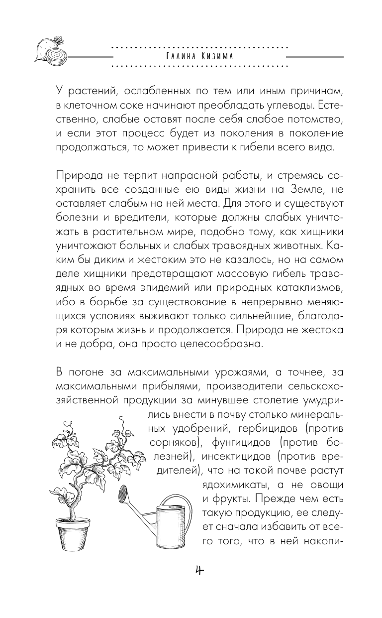 Одна из основных задач всех дачников в каждом посевном сезоне - уберечь свои сад и огород от нашествия вредителей и не дать болезням погубить урожай. Но как спасти растения от рисков, при этом не отравив урожай химикатами? В этой книге известного автора, садовода с 50-летним стажем Галины Кизимы представлена идеальная комплексная стратегия защиты от болезней и вредителей без применения ядов. Практические рекомендации помогут разобраться, в какое время и от каких напастей стоит проводить профилактику и как бороться с вредителями и болезнями системно, не растрачивая на эту задачу все силы. С авторскими советами вы поймете, как обеззаразить почву и сделать ее своей помощницей в поддержании здоровья растений. Используйте природные ресурсы, чтобы сэкономить свою энергию и деньги! Галина Кизима - любимый автор дачников, ее 50-летний опыт успешного земледелия на шести сотках ценится миллионами садоводов и огородников за разумный подход, при котором вырастить ранний и богатый урожай можно даже при самых неблагоприятных климатических условиях, сэкономив при этом силы, время и деньги!