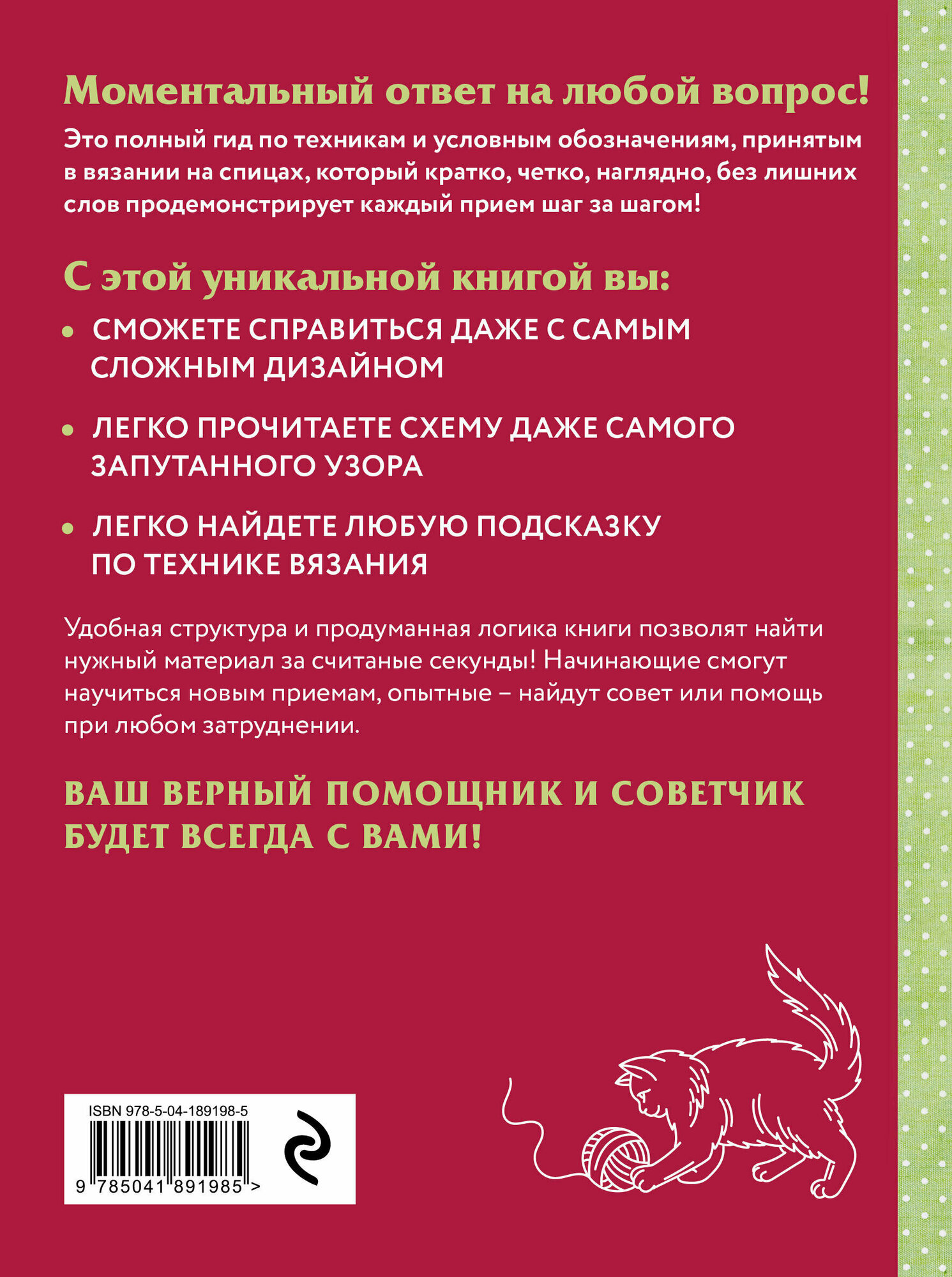 Верный помощник и советчик: уникальный мини-гид по чтению вязальных схем и технологии вязания! С этим удивительным гидом вы разгадаете все тайны условных обозначений и их сочетаний, встречающихся в книгах с узорами. Кратко, четко, наглядно! Каждый шаг представлен логично и последовательно, а сопровождающие иллюстрации помогут вам мастерски выполнять каждый прием. Теперь даже самые сложные схемы будут доступны для расшифровки, и вы сможете с легкостью воплотить в жизнь даже самые запутанные узоры, создавая настоящие шедевры вязального искусства! С этой уникальной книгой: - Вы сможете справиться даже с самым сложным дизайном. - Прочитаете любую схему, даже самого запутанного узора. - Легко найдете любую подсказку по технике вязания. Не имеет значения, только начинаете ли вы свой путь в вязании на спицах или уже являетесь опытным мастером - этот гид будет полезен каждому. Он не только идеально подходит для обучения вязанию, но и служит надежным справочником, готовым ответить на самые сложные вопросы. Полезный мини-гид, который займет почетное место на вашем рабочем столе. Это не просто книга - это ключ к миру вязания на спицах, который будет у вас под рукой, готовый подсказать и вдохновить вас в любой момент!