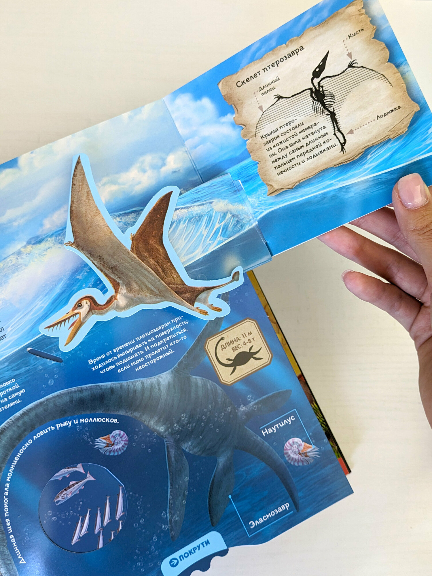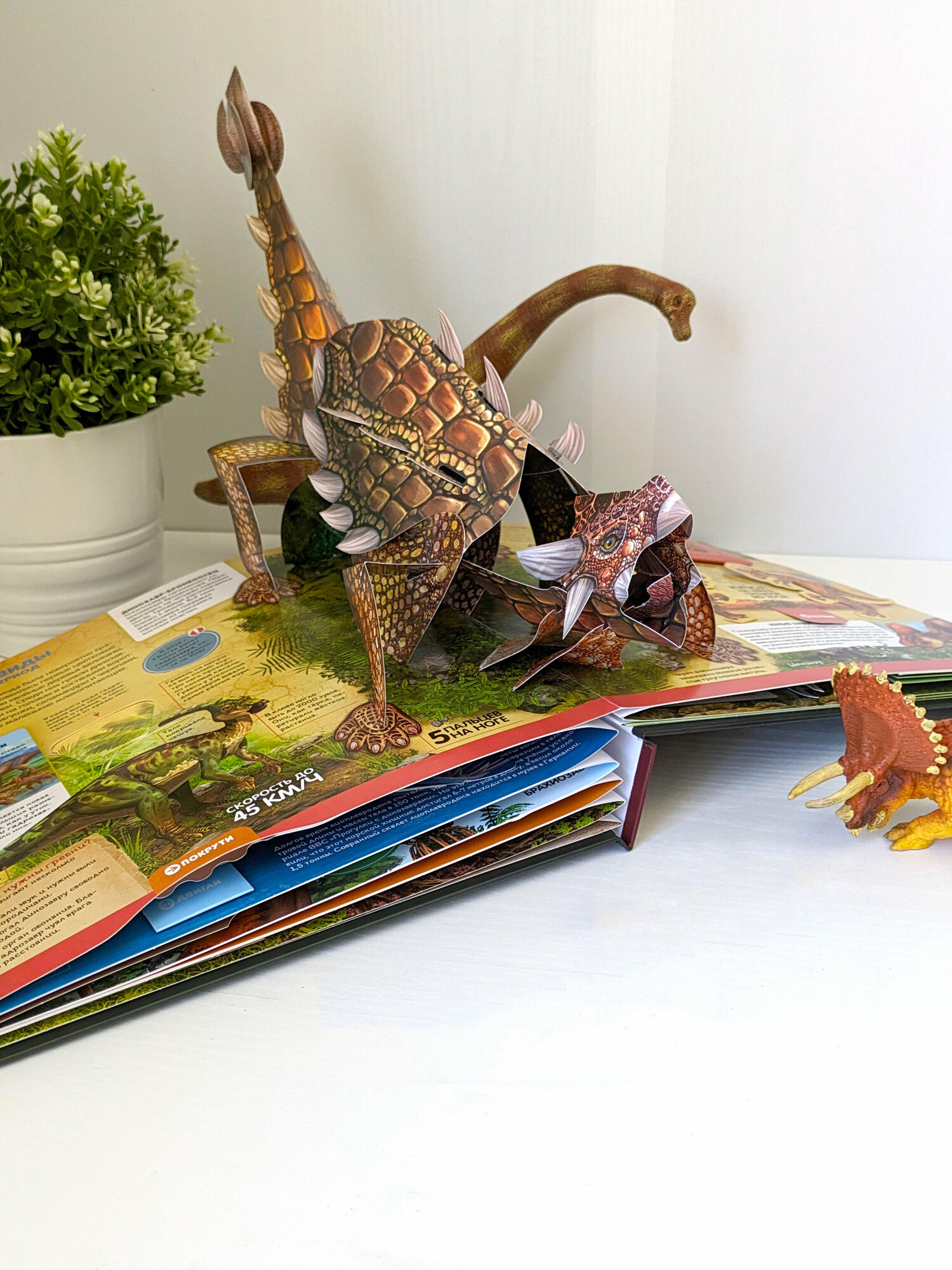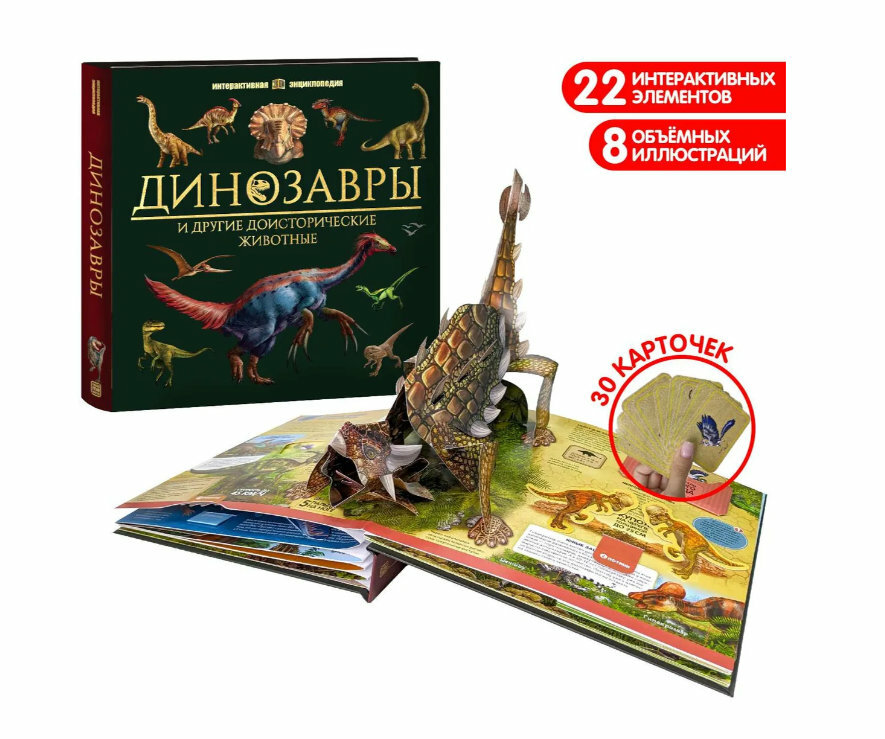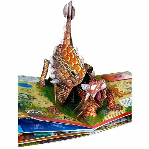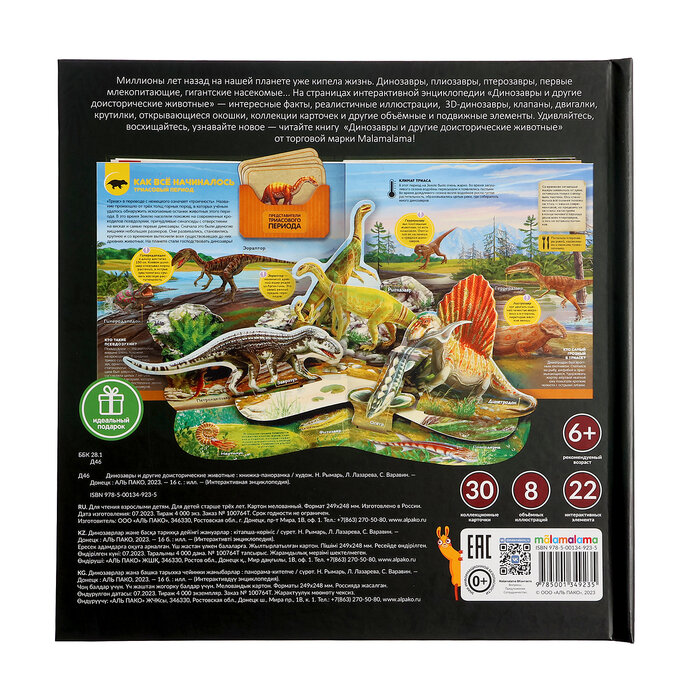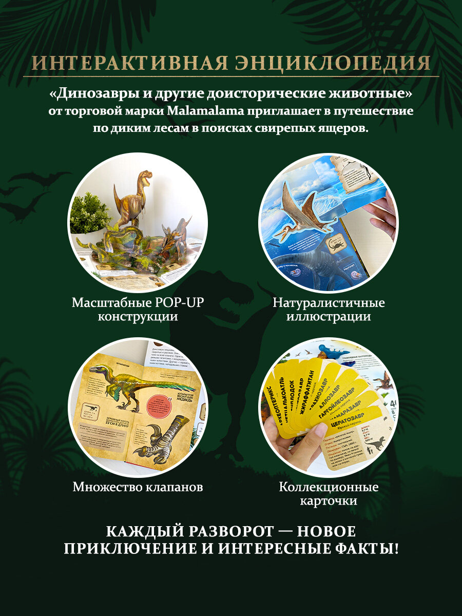 Интерактивная энциклопедия «Динозавры и другие доисторические животные» от торговой марки Malamalama — это захватывающее путешествие по доисторической Земле. Ваш малыш сможет прогуляться в древних тропических лесах, где познакомится со знаменитыми свирепыми ящерами. Масштабные POP-UP конструкции, множество клапанов и выдвигающихся элементов, интересные факты, натуралистичные иллюстрации — всё это ждёт юного читателя под обложкой энциклопедии. Эта первая энциклопедия динозавров для детей - красочная и познавательная книга, знакомящая школьников разного возраста с увлекательным миром этих невероятных животных. Книга, представленная в виде иллюстрированной энциклопедии, знакомит детей с удивительным миром динозавров в привлекательной форме. Это издание отлично подойдёт как мальчикам, так и девочкам, которые активно интересуются окружающим миром и животными. На страницах этой детской энциклопедии понятным для детей языком рассказывается о жизни этих древнейших животных на планете Земля. А красивые иллюстрации захватывают воображение ребёнка и помогают образно представить древний мир динозавров. Интерактивная энциклопедия — идеальная настольная книга для маленького почемучки. Разгадывайте главную загадку нашей планеты — изучайте удивительных ящеров вместе с Malamalama!