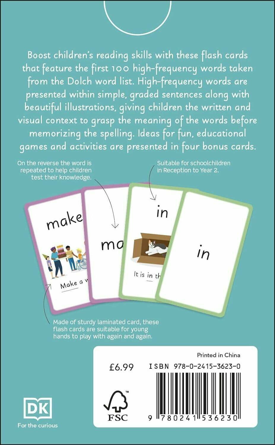 Learning high frequency words in English has never been more fun with this pack of beautifully illustrated flashcards for children aged 4-9. Introducing 100 essential high-frequency words, these cards are perfect for children beginning to learn English as a first or second language. Heard of high frequency words, but don't know where to begin' Don't worry, DK has got you covered! What are high frequency words'These are common words that children are taught to learn by sight either because they appear in such high-frequency (e.g. and, he, go) and being able to instantly recognize them helps children with fluency and independence or the words don't follow normal phonetic sound and spelling patterns. Interactive and engaging, these fun flash cards include: - Introduces 100 essential high-frequency words- Each card features a high-frequency word plus an illustration and simple sentence putting that word into context- On the reverse just the word is shown to help children memorise the words and test their knowledgeThe perfect accompaniment to English for Everyone Junior: My First English Dictionary, this fun, educational pack of 100 flashcards also functions as a stand-alone product for young learners who are starting to read and speak English, proving suitable for children who are learning English both as a first language and second language. These fun flashcards for kids are ideal for Teachers of English as a foreign language seeking extra resources, as well as parents and grandparents looking to support their child's education further. On one side of each card is an essential high-frequency word (words that frequently appear in text and are best remembered by sight) in large, bold lettering for easy reading. On the reverse, the word is repeated with a simple example sentence and illustration to put the word into context. Children can use the cards to learn the meaning of high-frequency words before memorising the words and testing their knowle.