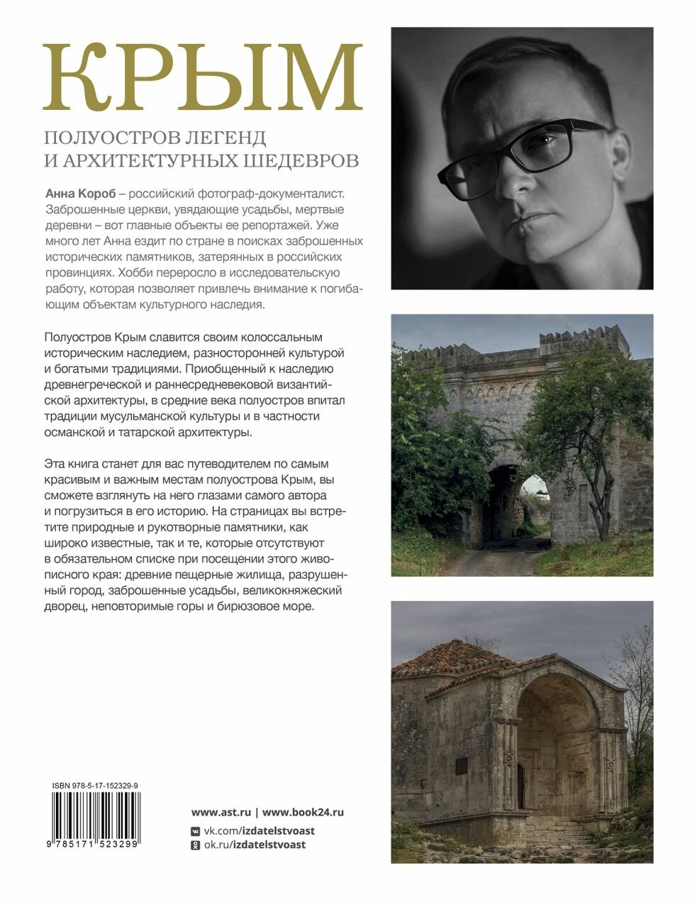 Анна Короб – российский фотограф-документалист. Заброшенные церкви, увядающие усадьбы, мертвые деревни – вот главные объекты ее репортажей. Уже много лет Анна ездит по стране в поисках заброшенных исторических памятников, затерянных в российских провинциях. Хобби переросло в исследовательскую работу, которая позволяет привлечь внимание к погибающим объектам культурного наследия. Полуостров Крым славится своим колоссальным историческим наследием, разносторонней культурой и богатыми традициями. Приобщенный к наследию древнегреческой и раннесредневековой византийской архитектуры, в средние века полуостров впитал традиции мусульманской культуры и в частности османской и татарской архитектуры. Эта книга станет для вас путеводителем по самым красивым и важным местам полуострова Крым, вы сможете взглянуть на него глазами самого автора и погрузиться в его историю. На страницах вы встретите природные и рукотворные памятники, как широко известные, так и те, которые отсутствуют в обязательном списке при посещении этого живописного края: древние пещерные жилища, разрушенный город, заброшенные усадьбы, великокняжеский дворец, неповторимые горы и бирюзовое море.
