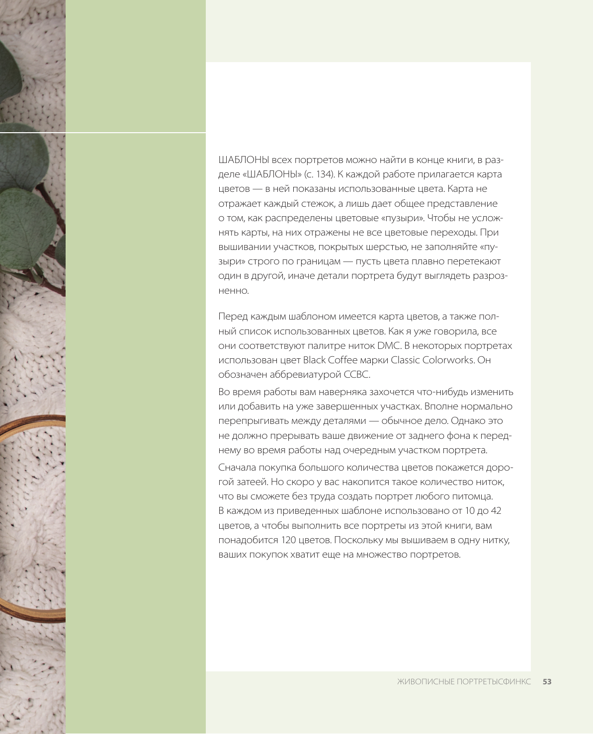 Освойте технику вышивки реалистичных портретов вместе с известной американской художницей Мишель Стауб! Более девяти лет она вышивает потрясающие дизайны с домашними питомцами и готова поделиться своим опытом! Автор расскажет все о том, как правильно фотографировать питомца и превращать снимок в шаблон для вышивания. Вы узнаете, как подготавливать ткань и переводить на нее получившийся рисунок, выбирать мулине и инструменты для работы. Освоите все тонкости процесса подбора оттенков ниток и научитесь делать цветовые переходы. А изучив всего 4 простых стежка, вы сможете самостоятельно вышивать контурные и цветные реалистичные портреты! Эта книга не только научит вас мастерски вышивать портреты ваших пушистых друзей, но и вдохновит на творчество, давая возможность каждому найти свой уникальный подход к созданию реалистичных вышивок.