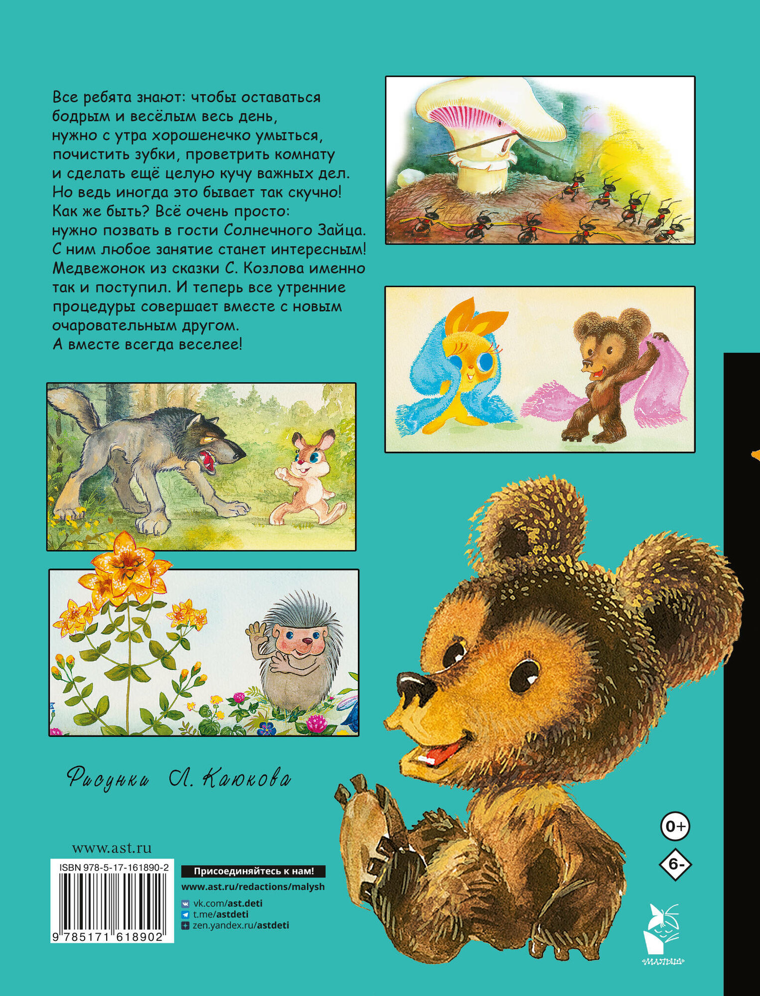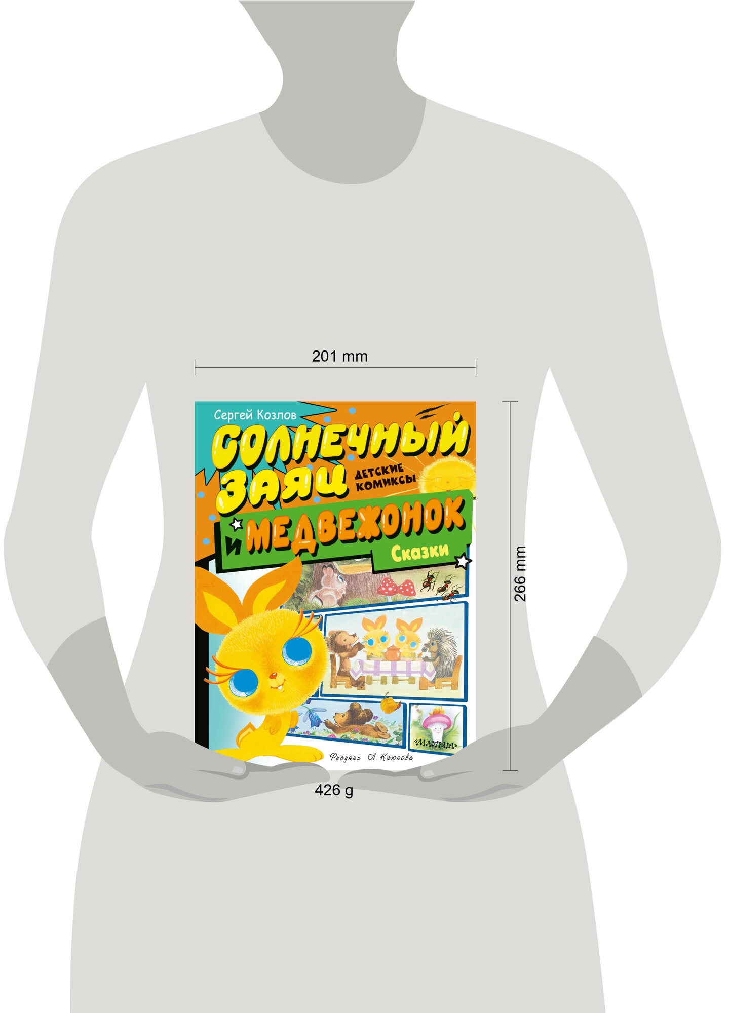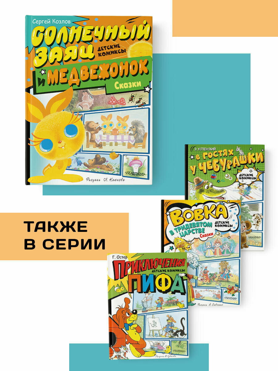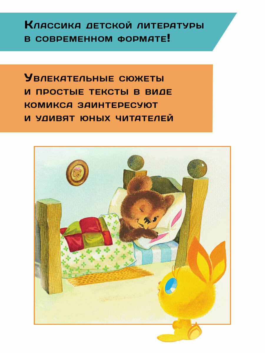 В серии «Детские комиксы» любимые сказки — в новой интерпретации! В книгу вошли трогательные истории Сергея Козлова про Ёжика, Медвежонка и их друзей. Мудрый Ёжик и добрый Медвежонок почистят зубки и сделают утреннюю зарядку с Солнечным Зайцем, а затем отправятся на прогулку в лес, где познакомятся с разными цветами и грибами и узнают, для чего какая травка в лесу нужна. Всего в сборнике четыре сказки — «Солнечный Заяц и Медвежонок», «Сыроежка», «Чёрный омут», «Волшебная травка Зверобой».