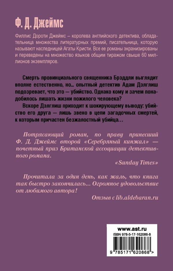 Смерть провинциального священника Брэддли выглядит вполне естественно… но опытный детектив Адам Дэлглиш подозревает, что это — убийство. Однако кому и зачем понадобилось лишать жизни пожилого человека? Вскоре Дэлглиш приходит к шокирующему выводу: убийство его друга — лишь звено в цепи загадочных смертей, к которым причастен безжалостный убийца…