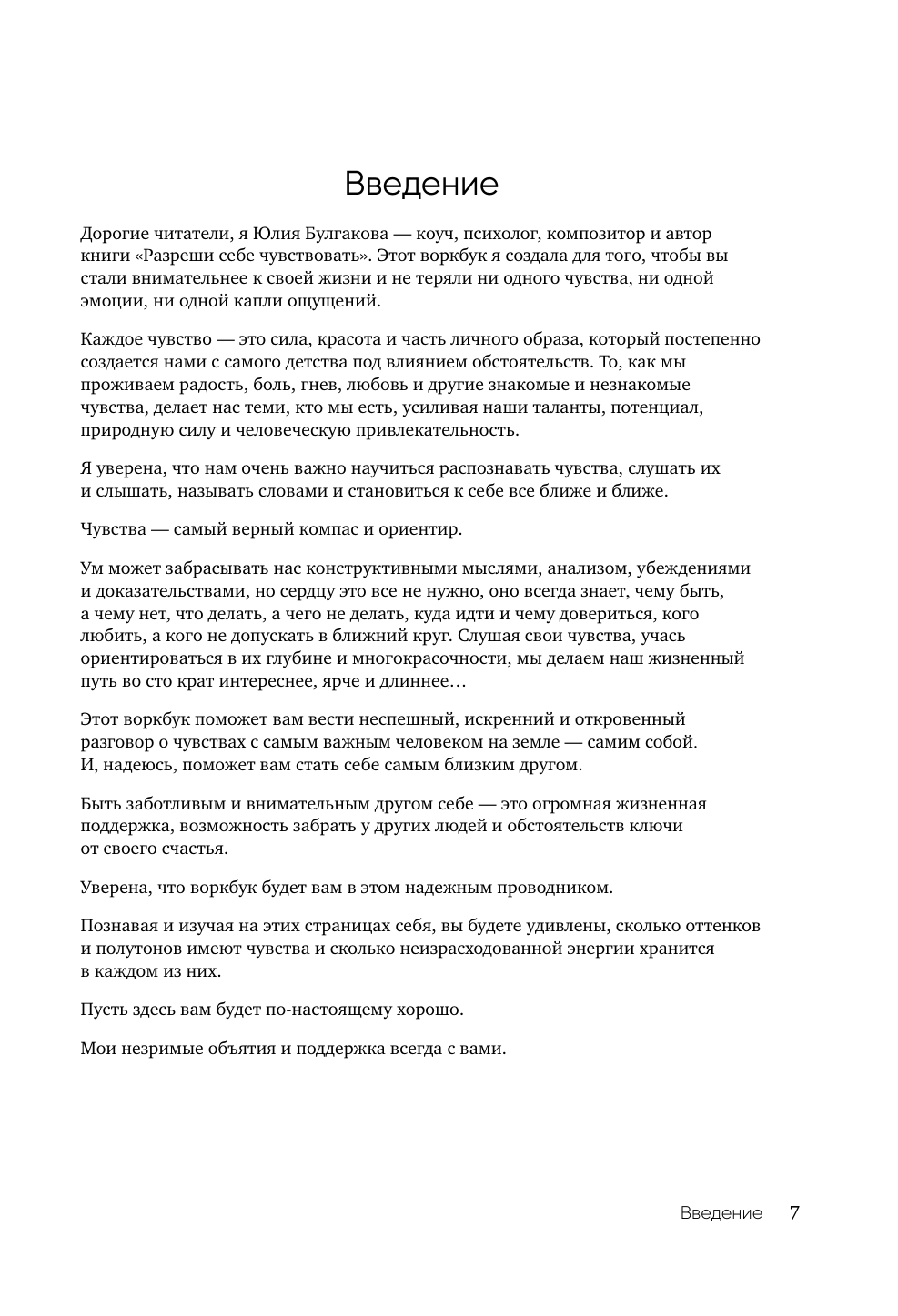 «Юлия Булгакова для меня — пример потрясающей глубины, мастерства и человечности в психологии и коучинге. Её книга "Разреши себе чувствовать" — моя любимая книга. А новый воркбук — ещё один замечательный инструмент, чтобы погрузиться в мир чувств и вернуться обновлёнными и вдохновлёнными, стать ближе и добрее к себе, понять, куда двигаться дальше. Это "живая", а не книжная психология. Психология души, сердца и искреннего любопытства к самим себе». — Ольга Примаченко, автор бестселлеров «К себе нежно», «С тобой я дома», «Всё закончится, а ты нет»