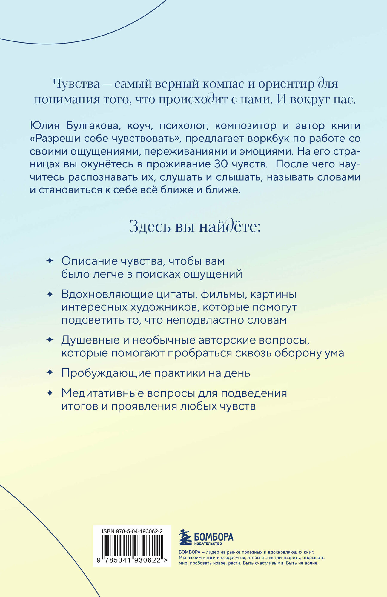 Юлия Булгакова, коуч, психолог, композитор и автор книги «Разреши себе чувствовать», предлагает воркбук по работе со своими ощущениями, переживаниями и эмоциями. На его страницах вы окунётесь в проживание 30 чувств. После чего научитесь распознавать их, слушать и слышать, называть словами и становиться к себе всё ближе и ближе.