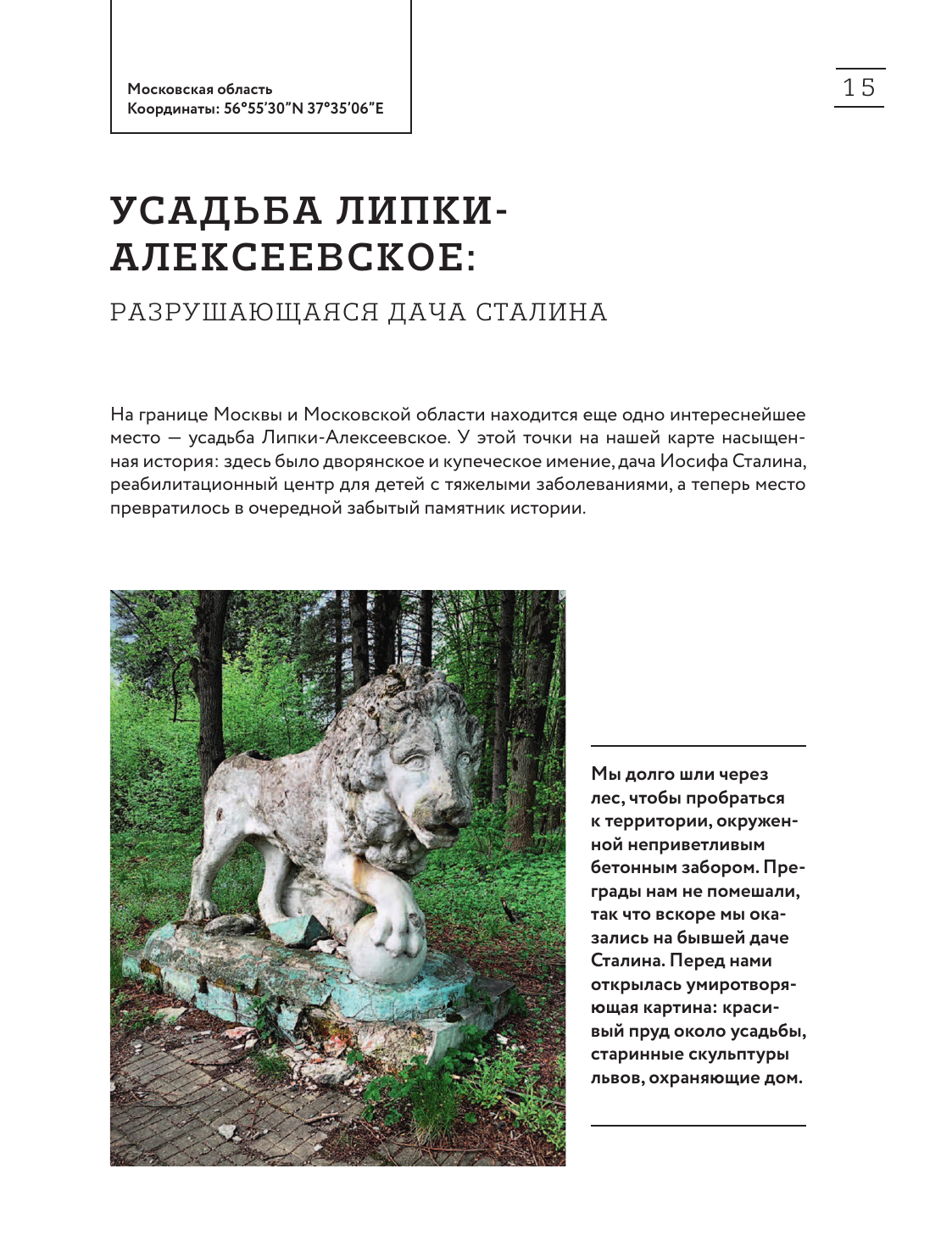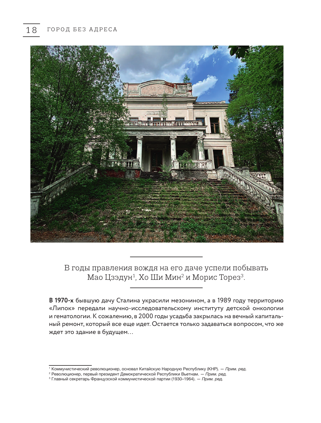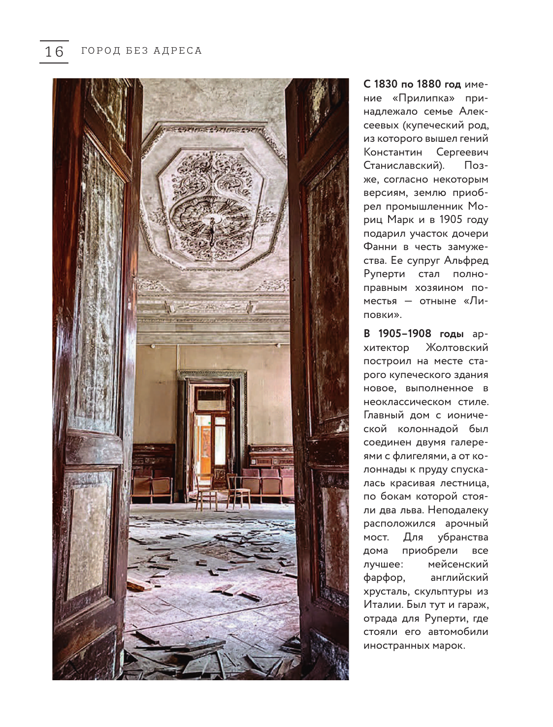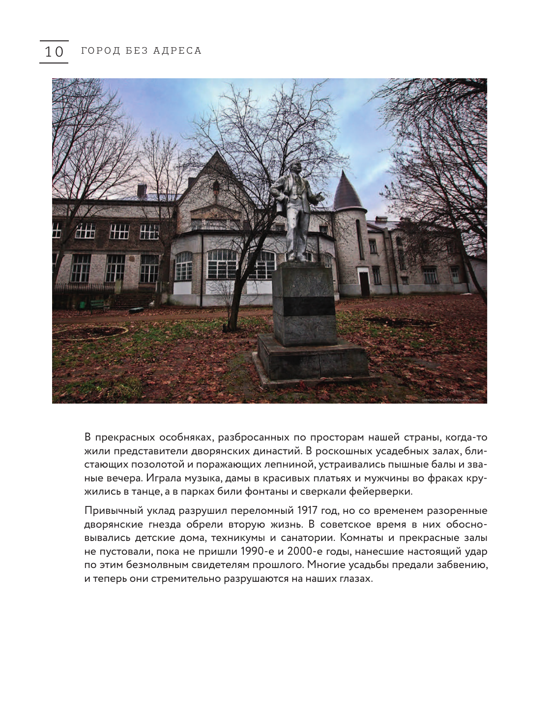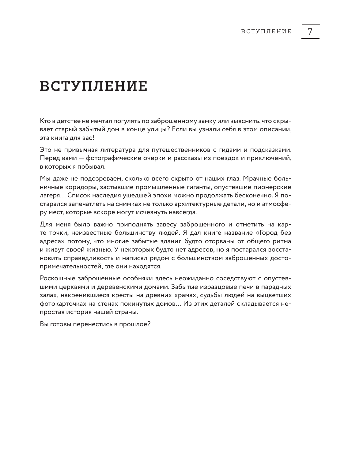 "Город без адреса" - это путешествие в прошлое, путеводитель по таинственным и заброшенным местам нашей страны. Алексей Грачев - фотограф, блогер и путешественник со стажем. Его блог собрал более 60000 увлеченных подписчиков. Поражающие красотой забытые усадьбы и мрачные заколоченные дома, ностальгические пионерские лагеря и старые больницы, поселки-призраки и огромные закрытые фабрики - на страницах книги сосредоточено множество мест, которые пугают и завораживают одновременно. Откроем дверь в прошлое вместе?