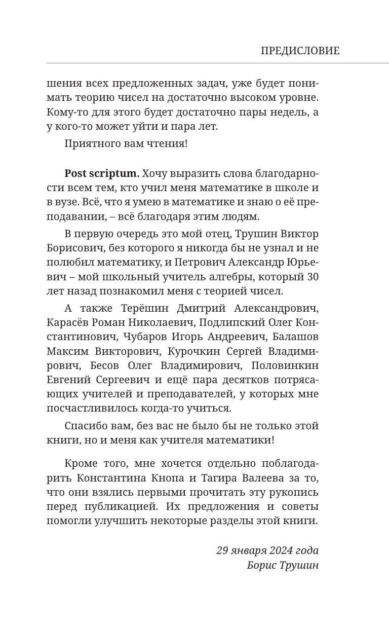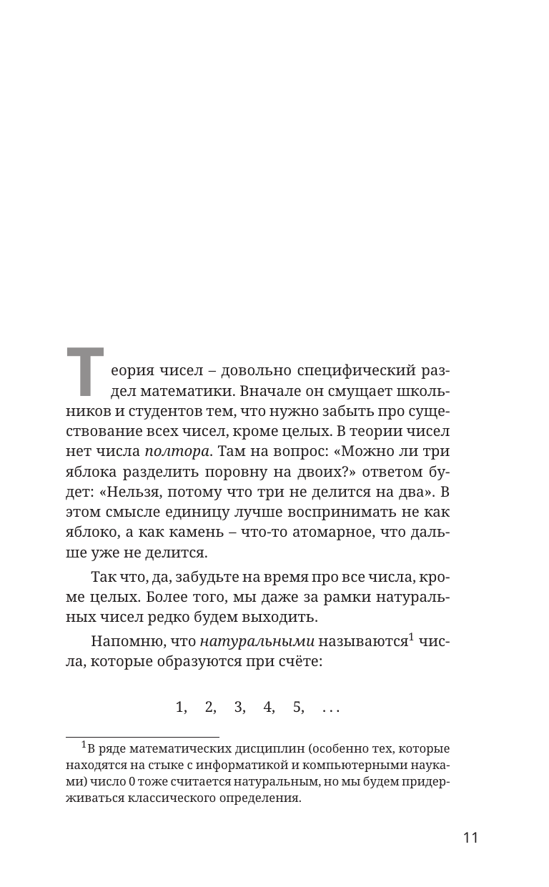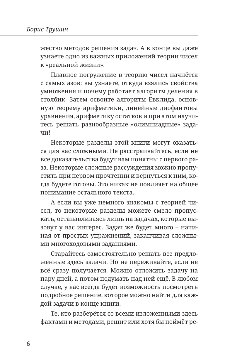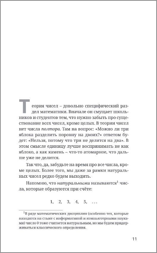 От автора: «Книга рассчитана на широкий круг читателей — от шестиклассников до людей, давно окончивших школу. В ней я собрал многолетний опыт преподавания теории чисел школьникам на уроках, кружках и факультативах. Книга позволяет познакомиться с теорией чисел и освоить азы этого интересного раздела математики без каких-либо предварительных знаний. В этой книге я попытался, начав с базовых принципов работы с целыми числами, пройти путь до содержательных теорем, по дороге осваивая множество методов решения задач. А в конце вы даже узнаете одно из важных приложений теории чисел к "реальной жизни"».