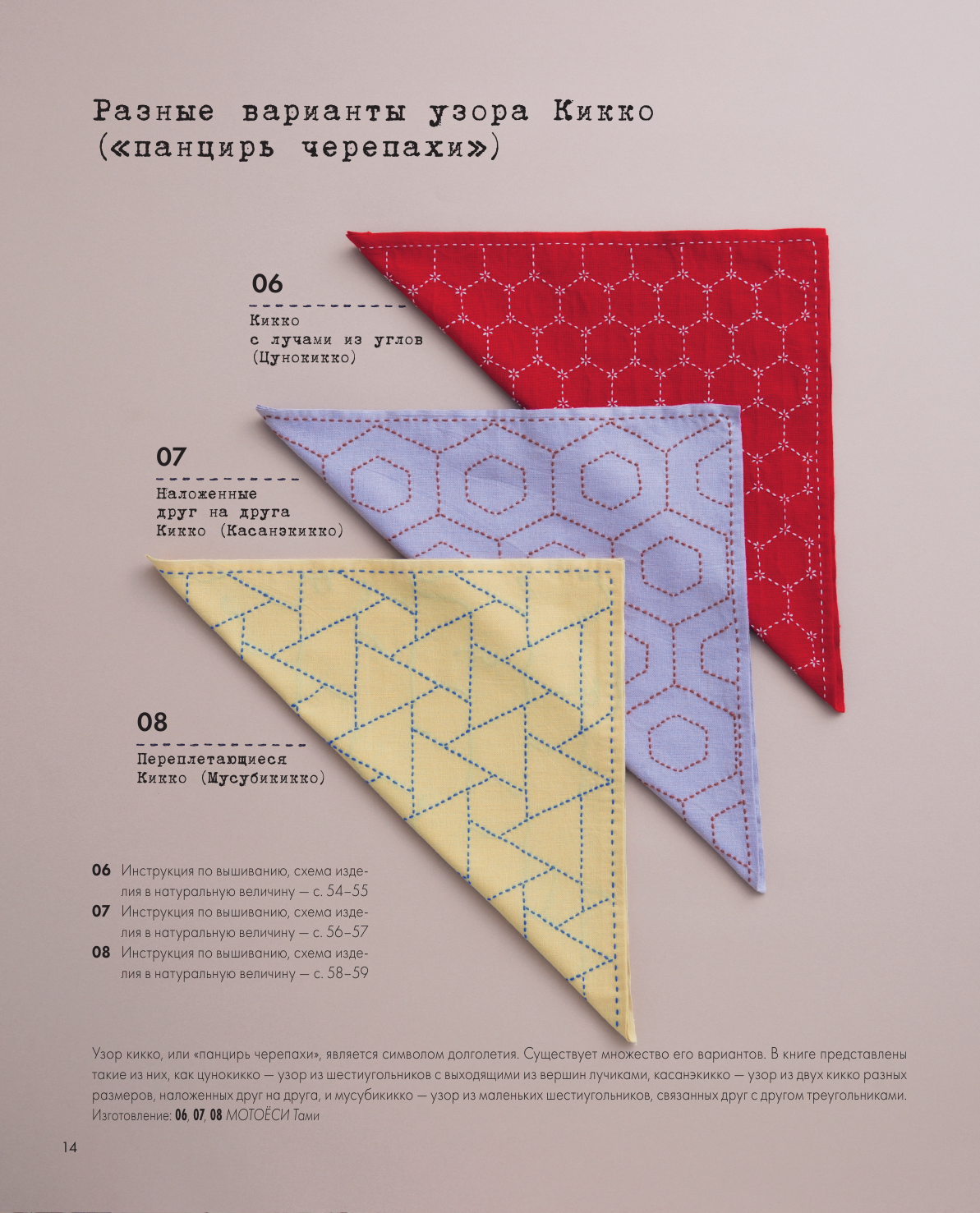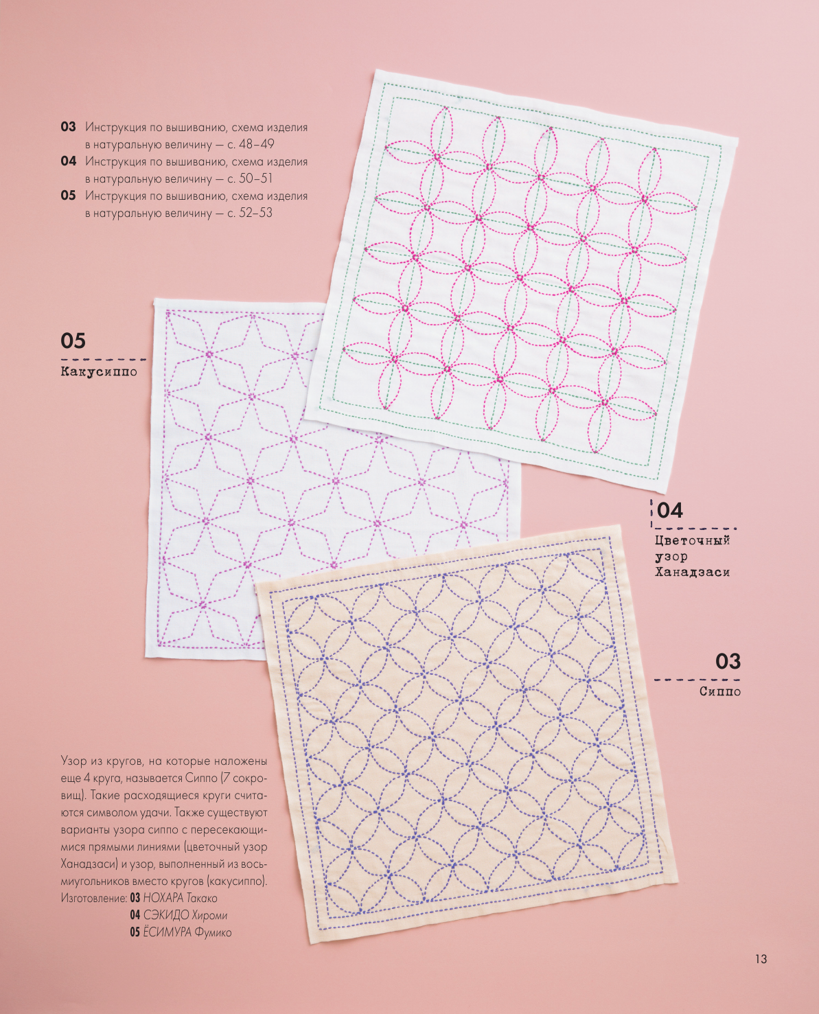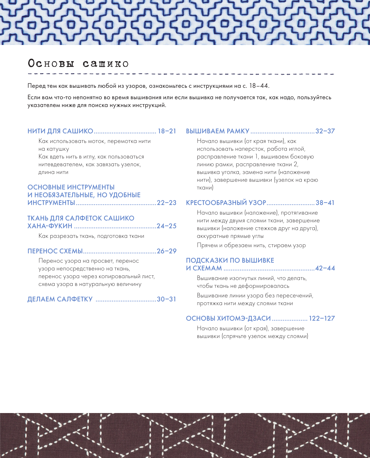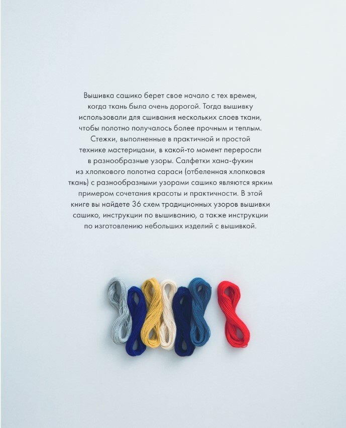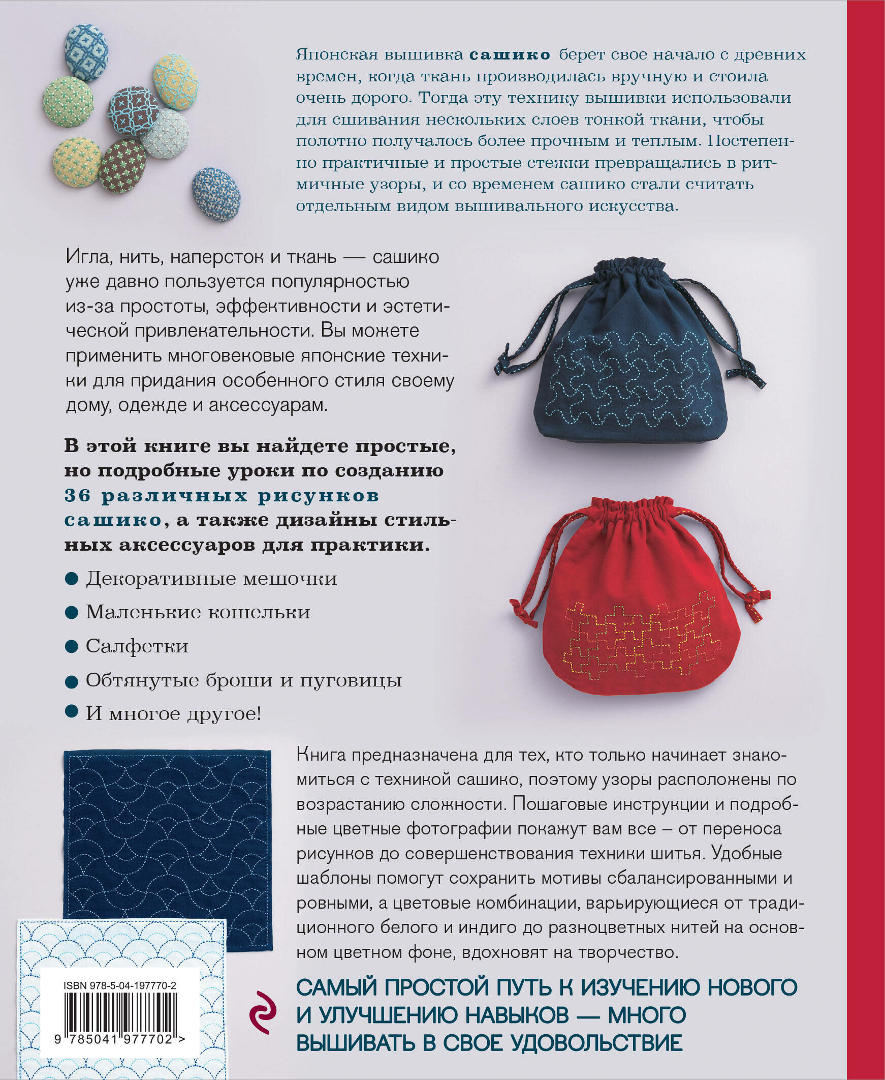 Игла, нить, наперсток и ткань — стежки японской вышивки сашико уже давно пользуются популярностью для квилтинга и вышивания из-за ее простоты, эффективности и эстетической привлекательности. Вы можете применить многовековые японские техники для придания особенного стиля своему дому, одежде и аксессуарам. В этой книге вы найдете простые, но подробные уроки по созданию 36 различных рисунков сашико, а также дизайны стильных домашних и личных аксессуаров для практики. Книга предназначена для тех, кто только начинает знакомиться с техникой сашико, поэтому узоры расположены по возрастанию сложности. Пошаговые инструкции и подробные цветные фотографии покажут вам все, от переноса рисунков до совершенствования техники шитья. Удобные шаблоны помогут сохранить ваши мотивы сбалансированными и ровными, а цветовые комбинации, варьирующиеся от традиционного белого и индиго до разноцветных нитей на основном цветном фоне, вдохновят на творчество. Самый простой путь к изучению нового и улучшению навыков — много вышивать в свое удовольствие.