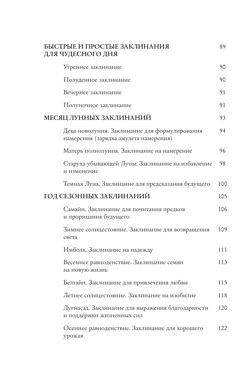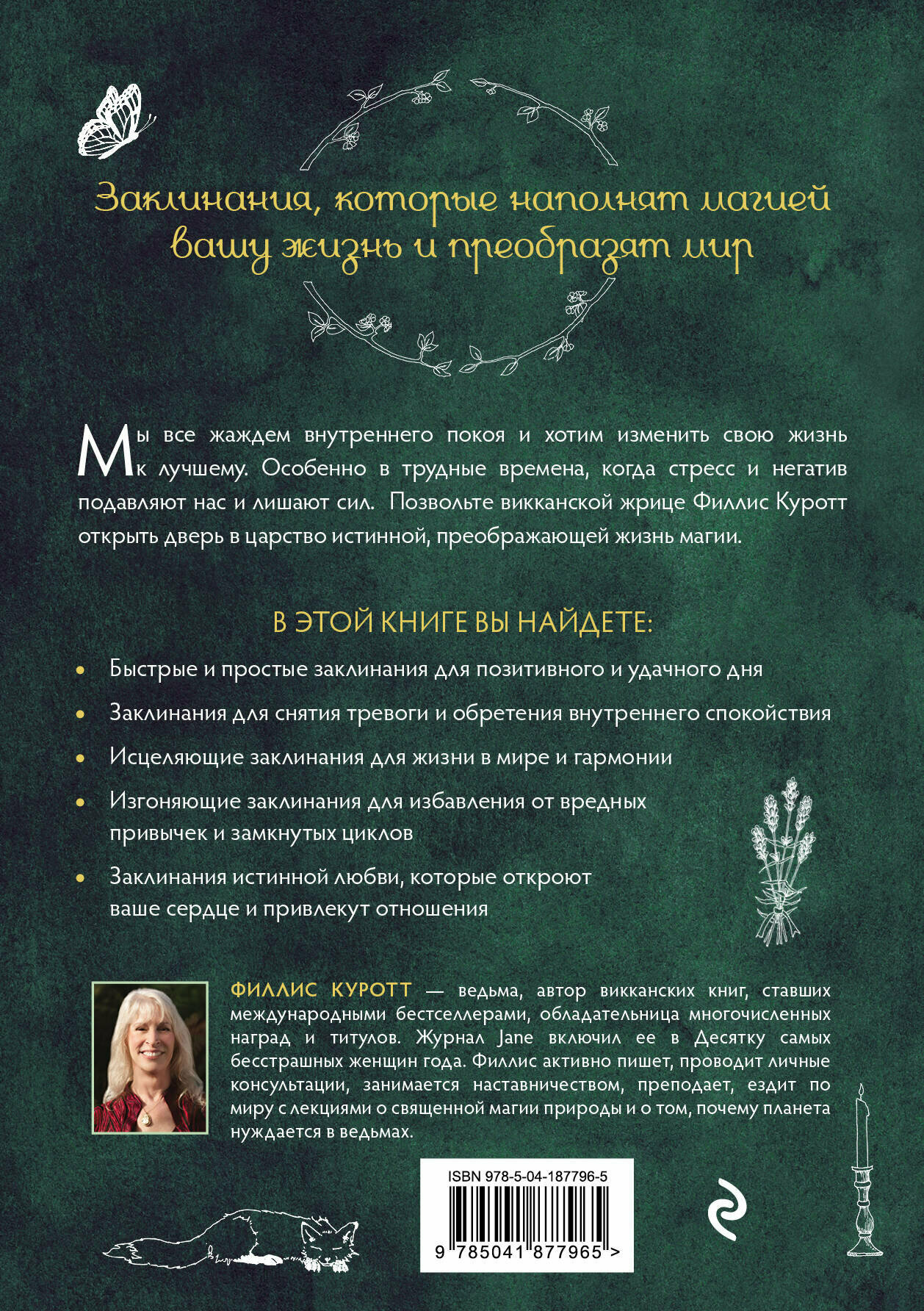 100 заклинаний от викканской жрицы и ведьмы Филлис Куротт преобразят самые важные сферы вашей жизни и наполнят окружающий мир магией. Из этой книги вы узнаете, как прожить удачный и позитивный день при помощи быстрого и простого заклинания. Познакомитесь с заклинаниями и ритуалами для снятия тревоги и обретения внутреннего спокойствия. Изгоняющие заклинания помогут избавиться от вредных привычек и замкнутых циклов, а заклинания истинной любви откроют ваше сердце и привлекут к вам гармоничные и здоровые отношения. Вы научитесь работать с силой стихий и черпать силу у мира Природы и сможете создавать свои собственные заклинания. Каждая магическая практика имеет четкую пошаговую инструкцию, понятную даже начинающим ведьмам.