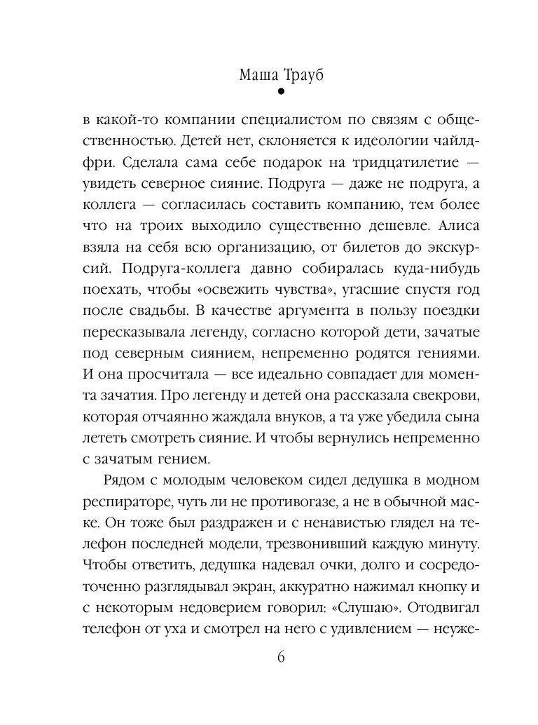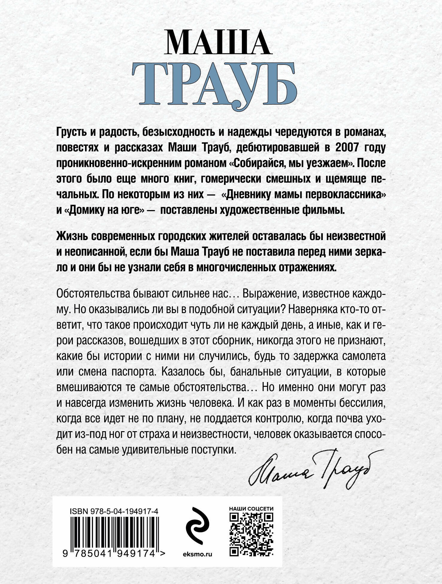 Обстоятельства бывают сильнее нас… Выражение, известное каждому. Но оказывались ли вы в подобной ситуации? Наверняка кто-то ответит, что такое происходит чуть ли не каждый день, а иные, как и герои рассказов, вошедших в этот сборник, никогда этого не признают, какие бы истории с ними ни случились, будь то задержка самолета или смена паспорта. Казалось бы, банальные ситуации, в которые вмешиваются те самые обстоятельства… Но именно они могут раз и навсегда изменить жизнь человека. И как раз в моменты бессилия, когда все идет не по плану, не поддается контролю, когда почва уходит из-под ног от страха и неизвестности, человек оказывается способен на самые удивительные поступки. Маша Трауб