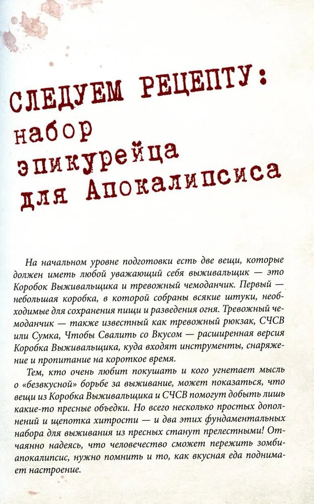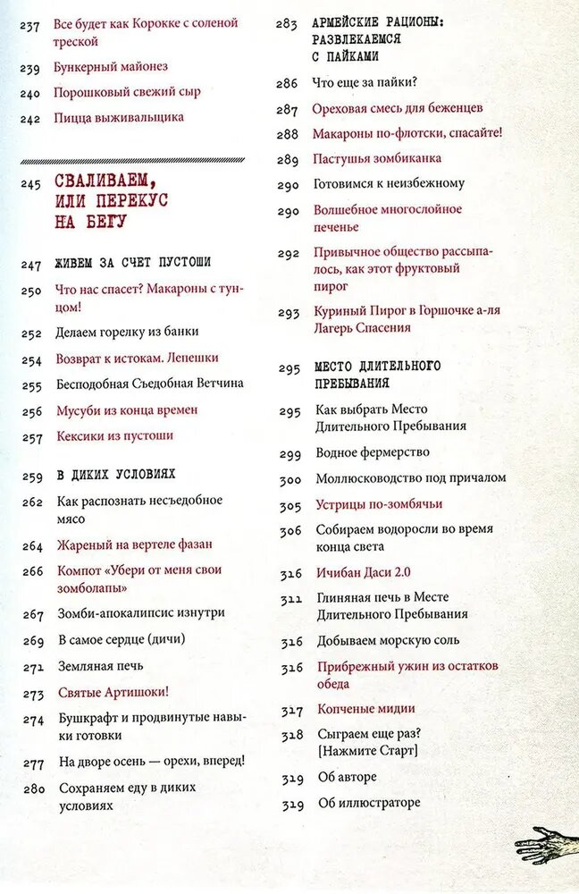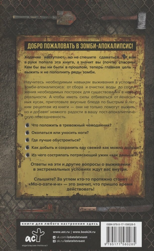 Добро пожаловать в зомби-апокалипсис!Ходячие наступают, но не спешите сдаваться... К вам в руки попала эта книга, а значит вы (почти) спасены! Кем бы вы ни были в прошлом, теперь главная цель — выжить и не пополнить ряды зомби. Научитесь необходимым навыкам выживания в условиях зомби-апокалипсиса: от сбора и очистки воды до сооружения необходимых построек для существования в новой реальности. А чтобы иметь силы отбиваться от ненасытных кусак, приготовьте вкусные блюда по быстрым и легким рецептам из книги — они не только помогут выжить, но и добавят немного радости в вашу пост-апокалиптическую повседневность. Что положить в тревожный чемоданчик?Окопаться или уносить ноги?Где лучше обустроиться?Как добыть и сохранить еду свежей как можно дольше?Из чего состряпать потрясающий ужин «как раньше»?Ответы на эти и другие вопросы о выживании в экстремальных условиях ждут вас внутри. Слышите? За углом кто-то протяжно стонет «Мо-о-озги-и-и» — это значит, что пришло время действовать!