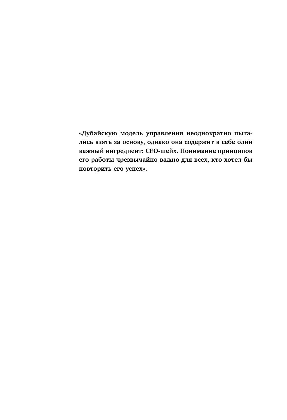 «Дубай — пример настоящего экономического чуда. Это государство-стартап, которое смогло конвертировать нефтяные доходы в создание современного бизнес-центра, привлекающего инвесторов со всего мира. Мне всегда было интересно, как и почему у Дубая получилось превратить пустыню в ближневосточный Нью-Йорк? Книга шейха Моххамеда, архитектора развития Дубая, показывает, что в основе успеха лежат мудрые принципы и долгосрочное видение, амбициозные цели и большая мечта».