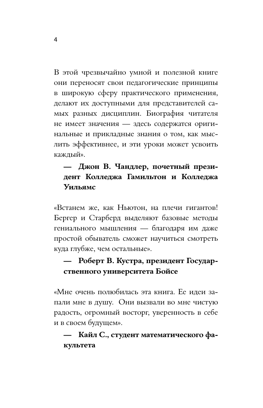 А потому вовсе не удивительно, что эффективность мышления — залог успеха студентов, профессионалов, бизнес-гуру, художников, писателей, политиков и каждого из нас в повседневной жизни. Эффективное мышление необходимо и для совершенствования любых навыков — без него не прийти к новаторским идеям, не решить сложных задач новыми способами, не увидеть скрытые возможности, не приняться за дело. Как это ни удивительно, базовые методы, которые учат мыслить яснее, оригинальнее и эффективнее, по сути, одинаковы для всех сфер нашей жизни! Более того, эти самые методы можно описать и освоить. Врожденный талант, которым наделены лишь избранные, здесь ни при чем, и не нужно быть гением, чтобы научиться эффективному мышлению. Каждому из нас под силу изучить и применять эти стратегии, и наша книга как раз об этом — о пяти мыслительных привычках, которые можно использовать в повседневной жизни. Они многих вдохновили на движение к успеху. Надеемся, что и вы его добьетесь.