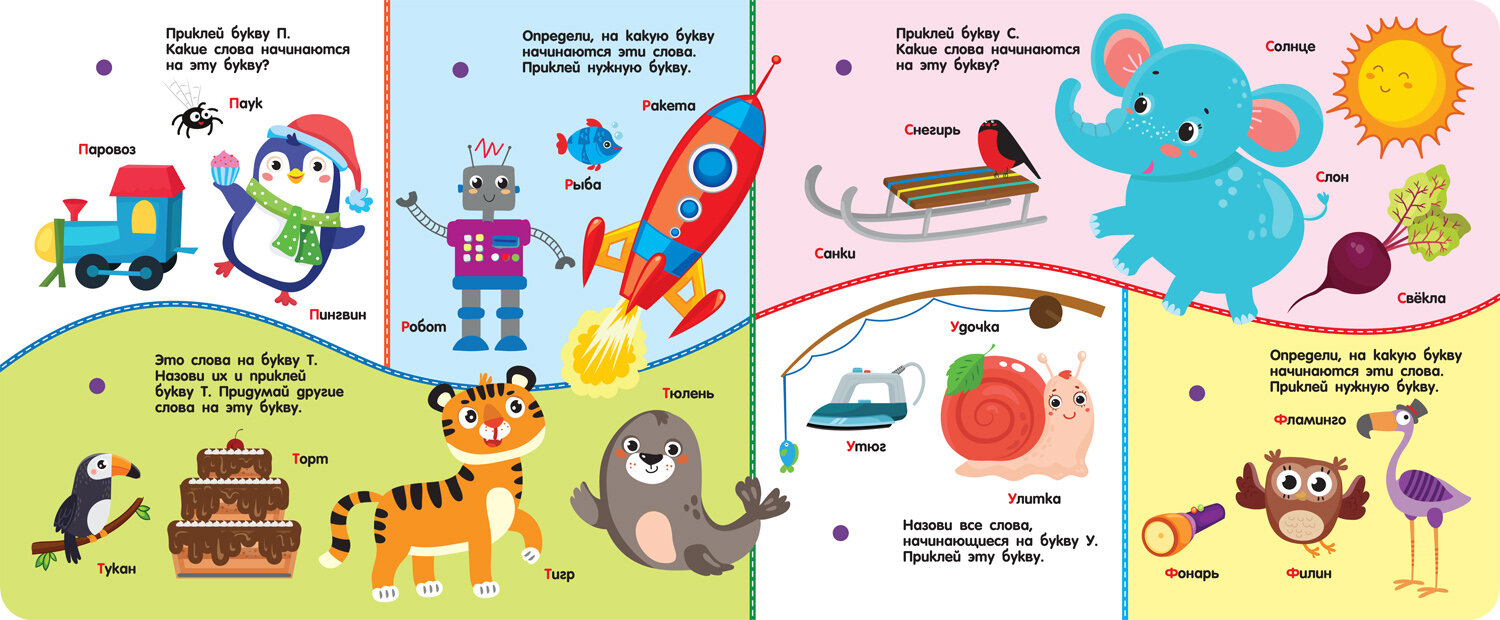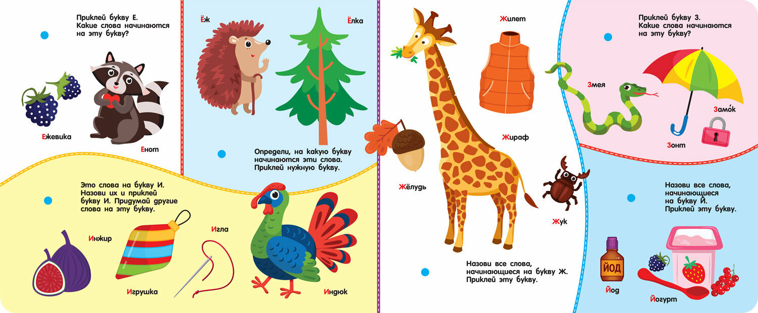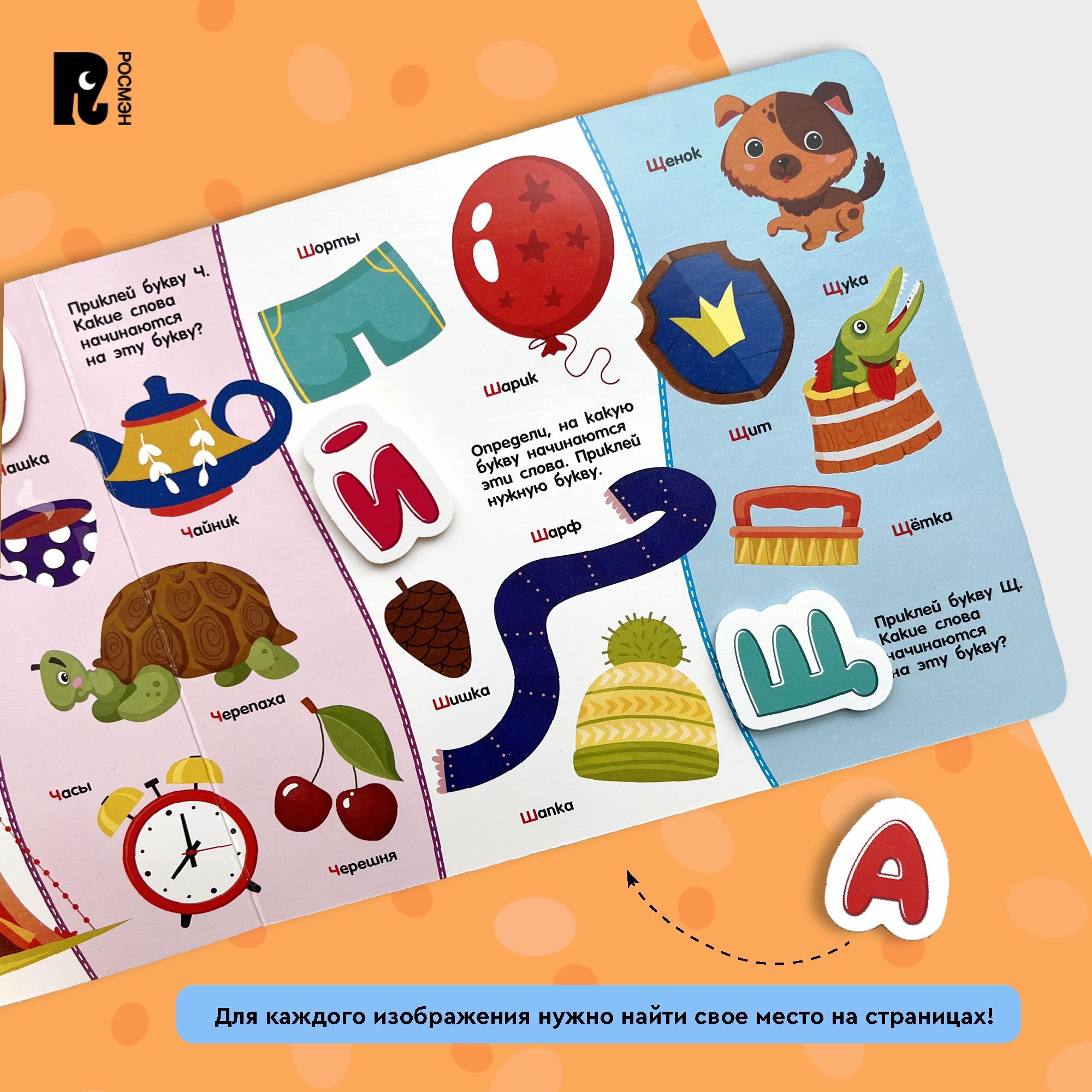 Его ждёт конверт с фигурками на липучках, для каждой из которых нужно найти место на страницах.