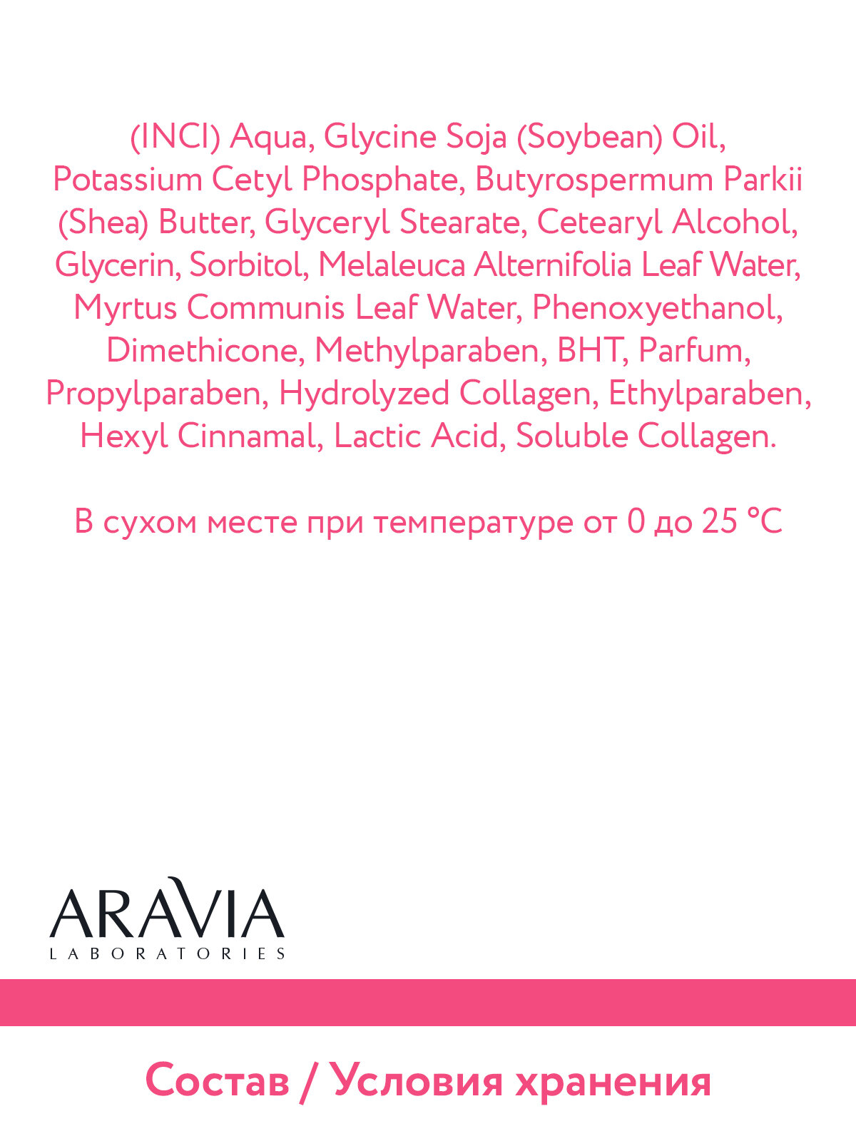 | Состав | Aqua, Glycine Soja (Soybean) Oil, Potassium Cetyl Phosphate, Butyrospermum Parkii (Shea) Butter, Glyceryl Stearate, Cetearyl Alcohol, Glycerin, Sorbitol, Melaleuca Alternifolia Leaf Water, Myrtus Communis Leaf Water, Phenoxyethanol, Dimethicone, Methylparaben, BHT, Parfum, Propylparaben, Hydrolyzed Collagen, Ethylparaben, Hexyl Cinnamal, Lactic Acid, Soluble Collagen. |