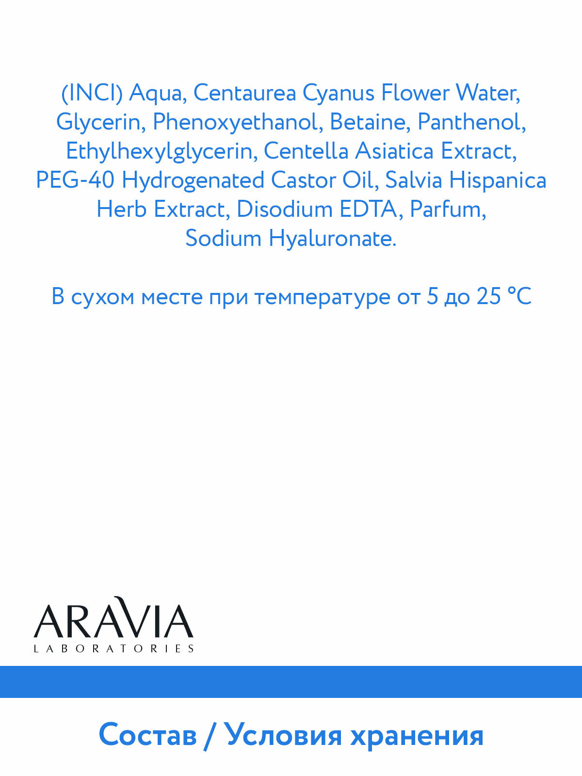 | Состав | Aqua, centaurea cyanus flower water, glycerin, phenoxyethanol, betaine, panthenol, ethylhexylglycerin, centella asiatica extract, peg-40 hydrogenated castor oil, salvia hispanica herb extract, disodium edta, parfum, sodium hyaluronate |