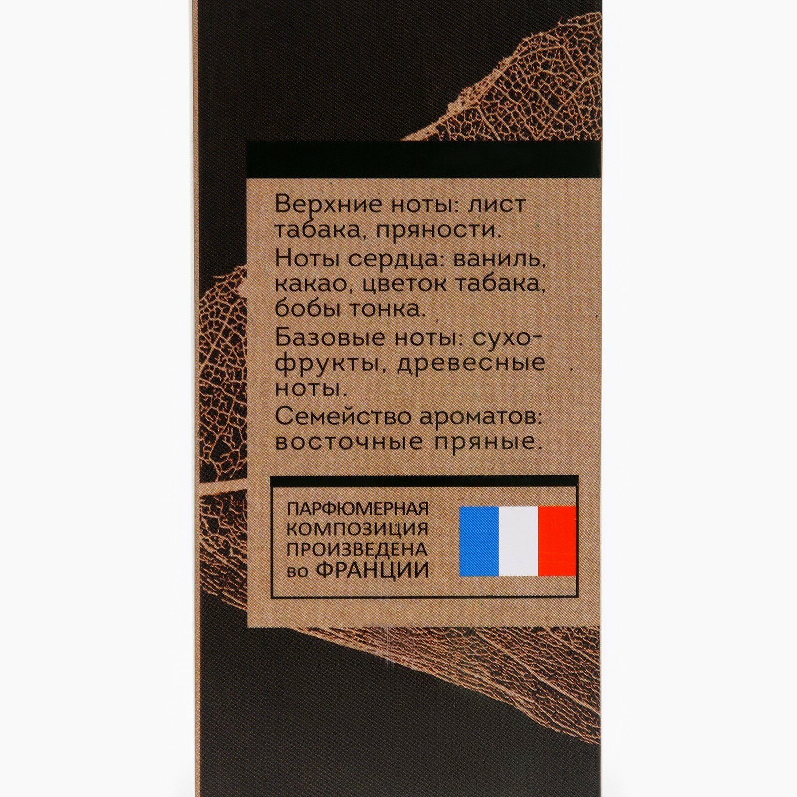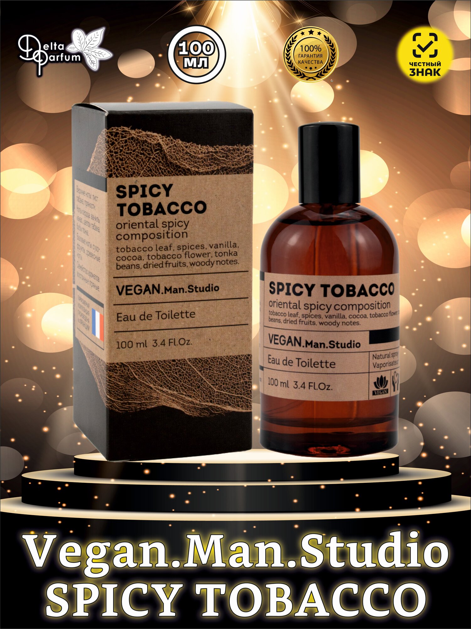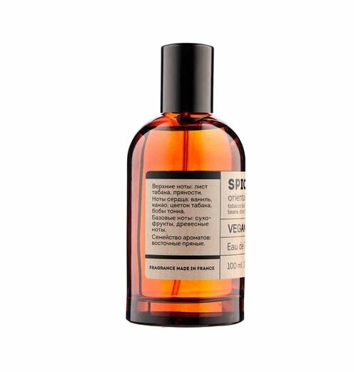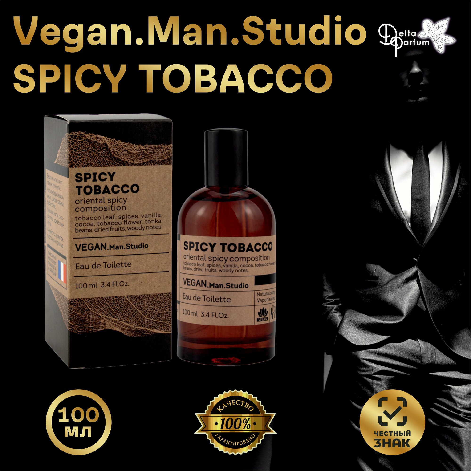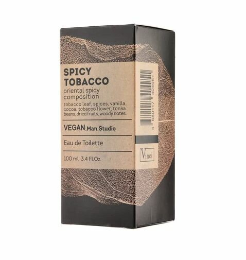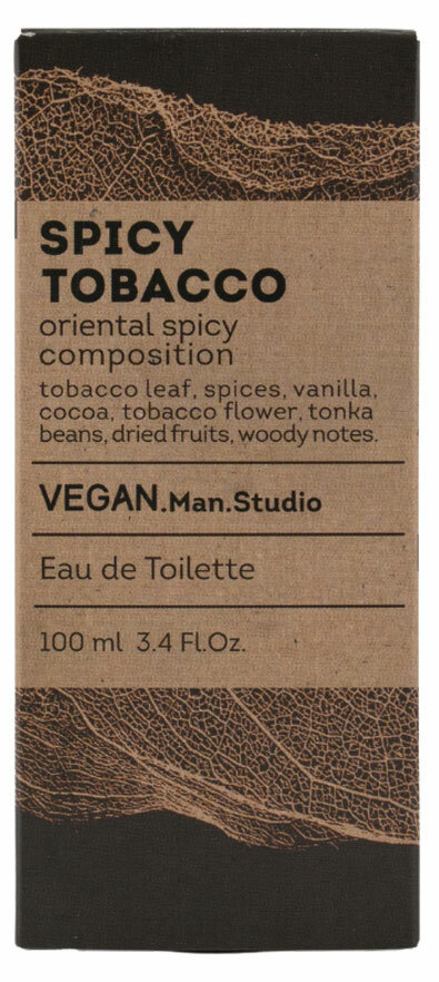 «Веган МЭН студио спайси тобакко». Парфюмерная композиция относится К семейству восточных пряных ароматов, ярким представителем которых является туалетная вода TOBACCO VANILLA TOM FORD. Верхние ноты: лист табака, пряности. Ноты сердца: ваниль, какао, цветок табака, бобы тонка. базовые ноты: сухофрукты, древесина.
