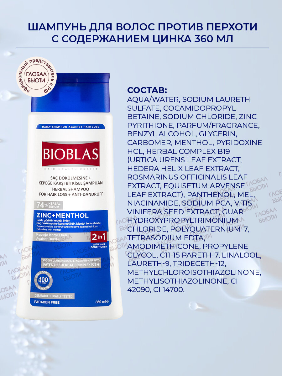| Состав | aqua/water; sodium laureth sulfate; cocamidopropyl betaine; sodium chloride; zinc pyrithione; parfum/fragrance; benzyl alcohol; glycerin; carbomer; menthol; pyridoxine hcl; herbal complex b19 (urtica urens leaf extract; hedera helix leaf extract; rosmarinus officinalis leaf extract; equisetum arvense leaf extract); panthenol; mel; niacinamide; sodium pca; vitis vinifera seed extract; guar hydroxypropyltrimonium chloride; polyquaternium-7; tetrasodium edta; amodimethicone; propylene glycol; c11-15 pareth-7; linalool; laureth-9; trideceth-12; methylchloroisothiazolinone; methylisothiazolinone |