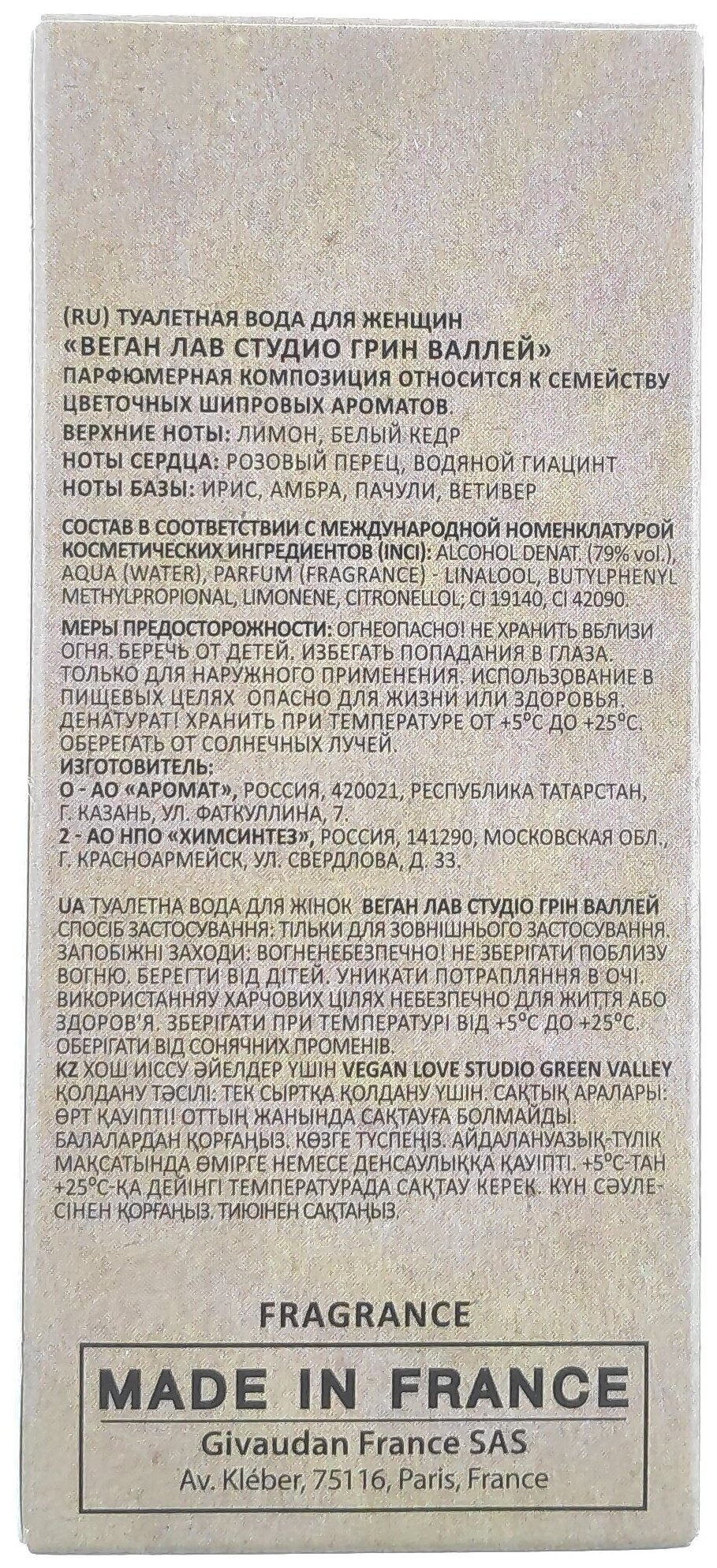 Туалетная вода женская Vegan Love Studio Green Valley, 100 мл. Аромат любви, нежных объятий и трепетных поцелуев открывается яркой свежестью нот лимона и водяного гиацинта. Жасмин наполняет "сердце" нежной чувственностью. В шлейфе аромата звучат ноты белого мускуса, ветивера, пачули, ириса и амбры.Группа ароматов: цветочные, шипровые.Философия аромата: Chance eau Fraiche (Chanel).Верхние ноты: лимон, белый кедр.Ноты сердца: розовый перец, водяной гиацинт.Базовые ноты: ирис, амбра, пачули, ветивер.