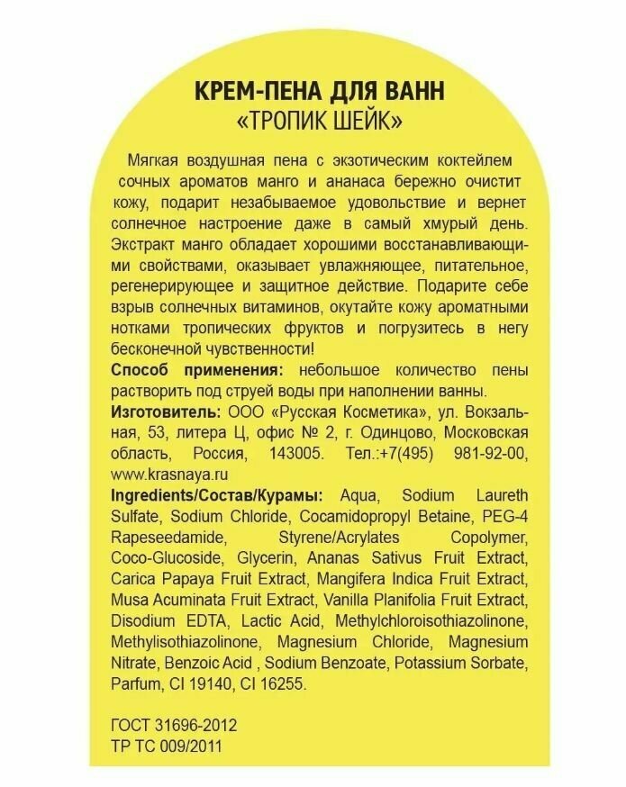 | Химический состав | Aqua, Sodium Laureth Sulfate, Sodium Chloride, Cocamidopropyl Betaine, PEG-4 Rapeseedamide, Styrene/Acrylates Copolymer, Coco-Glucoside, Glycerin, Ananas Sativus Fruit Extract, Carica Papaya Fruit Extract, Mangifera Indica Fruit Extract, Musa Acuminata Fruit Extract, Vanilla Planifolia Fruit Extract, Disodium EDTA, Lactic Acid, Methylchloroisothiazolinone, Methylisothiazolinone, Magnesium Chloride, Magnesium Nitrate, Benzoic Acid , Sodium Benzoate, Potassium Sorbate, Parfum, СI 19140, CI 16255. |