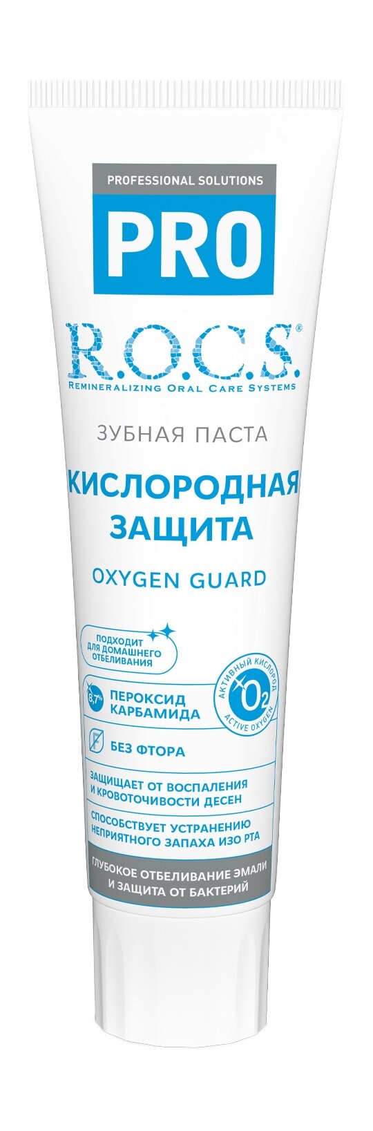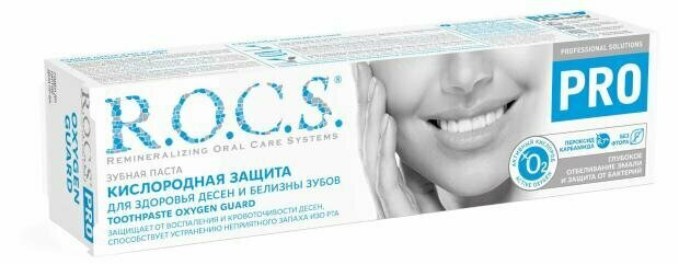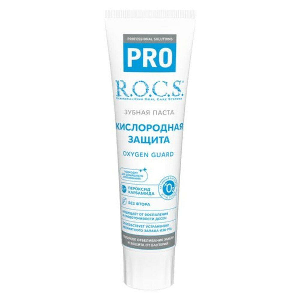 Паста зубная R.O.C.S. PRO "Кислородная защита" содержит активный кислород, обладающий отбеливающим и бактерицидным действиями по уходу и гигиене за полостью рта и удалению зубного камня. Лечебная отбеливающая паста R.O.C.S эффективно устраняет неприятный запах изо рта. Технология OXY WHITENING PRO-SYSTEM натуральной профессиональной пасты основана на принципах профессионального отбеливания зубов чтобы отбелить зубы и избавить вас от кариеса. При взаимодействии зубной пасты R.O.C.S со слюной высвобождается атомарный кислород, который проникает в глубину эмали зуба и обесцвечивает налет на зубах, при этом безопасна для десен. Паста содержит 8,7% пероксид карбамида. Отсутствие защитной мембраны и заполненность тубы на 2/3, обусловлены особенностями рецептуры.