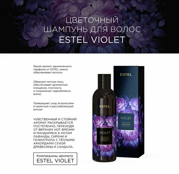 В косметический набор для ухода за волосами и телом входит цветочный шампунь VIOLET, бальзам для окрашенных волос ROSE и гель для душа VERT. Яркий аромат одноимённого парфюма от ESTEL нежно обволакивает волосы. Цветочный шампунь VIOLET образует мягкую пену, обеспечивает деликатное очищение, плотность и сохранение гидробаланса волос. Превращает уход за волосами в приятный и расслабляющий ритуал. Чувственный и стойкий аромат раскрывается постепенно, переходя от верхних нот фрезии и мандарина к нотам лаванды, сирени и гелиотропа с тёплыми аккордами сухой древесины и сандала. Обеспечивает сохранение цвета и блеска окрашенных волос. Способствует сохранению природного гидробаланса. Бальзам ROSE обеспечивает шелковистость и кашемировую гладкость волос по всей длине. Притягательный аромат раскрывается постепенно, переходя от верхних нот фруктов и зелени к нотам цветов японской вишни, розы и гедиона с тёплыми аккордами белого мускуса и древесины. Цветочный гель для душа VERT при контакте с водой превращается в мягкую и шелковистую пену. Нежно очищает, делает кожу мягкой и эластичной, не нарушая природного гидробаланса. Терпкий аромат свежих зелёных листьев и цветов поднимает настроение. Estel Professional - российский бренд профессиональной косметики для волос и тела, который широко известен среди парикмахеров и салонов красоты. Благодаря высокому качеству продукции и инновационным технологиям, Estel Professional занимает лидирующие позиции на рынке профессиональной косметики для волос. СПОСОБ ПРИМЕНЕНИЯ: Нанесите шампунь VIOLET на влажные волосы, вспеньте, смойте. Затем нанесите бальзам ROSE на чистые влажные волосы, хорошо распределите по всей длине, уделяя особое внимание кончикам волос. Оставьте на 2–3 мин. Смойте. Нанесите небольшое количество геля VERT на влажную кожу, вспеньте, смойте, или добавьте под струю воды для принятия пенной ванны.