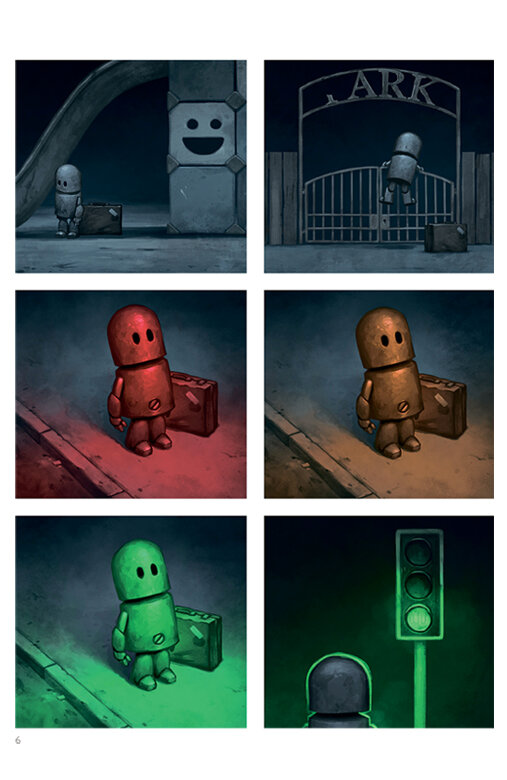 Современный британский цифровой художник Мэтт Диксон создает выразительные истории о приключениях роботов — в них нет слов, но есть и лукавая усмешка, и радость узнавания, и неожиданные вопросы. На которые каждый читатель волен отвечать по-своему.