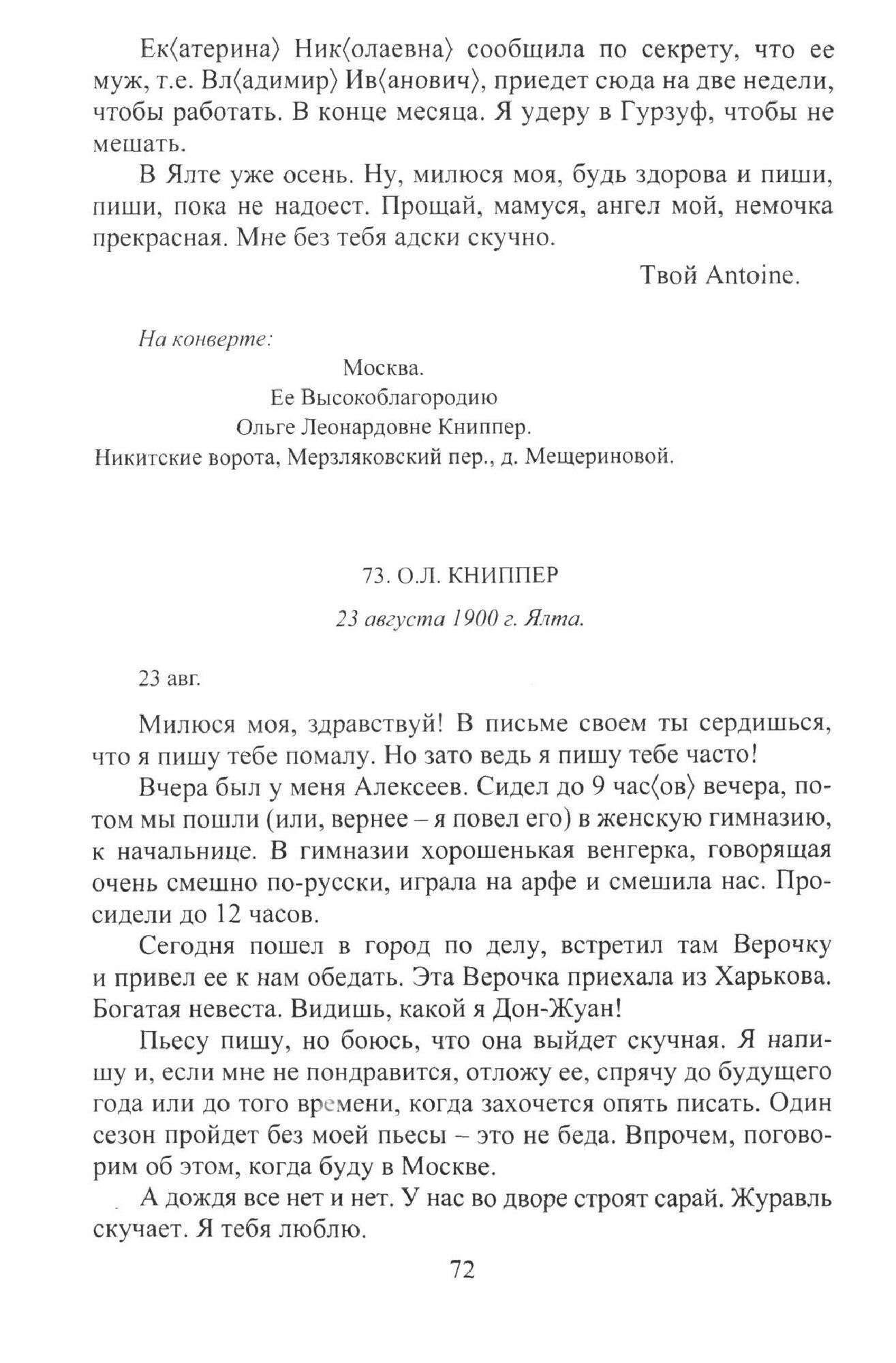 В сборник вошли письма А. П. Чехова мхатовцам, а также несколько писем А. М. Горькому, А. С. Суворину, В. Ф. Комиссаржевской, Ф. Д. Батюшкову и др. В письмах отражены деловые отношения писателя с МХТ, его требования к постановке своих пьес, к подбору актеров; раскрываются также и дружеские связи с режиссерами и актерами театра. Особое место занимает личная переписка с ведущей актрисой МХТ и женой О. Л. Книппер-Чеховой. Для широкого круга читателей. Составитель Н. Д. Александрова.