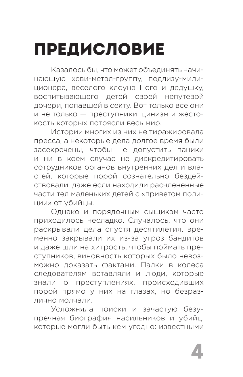 Казалось бы, что может объединять начинающую хеви-метал группу, подлизу-милиционера, веселого клоуна Пого и дедушку, воспитывающего внуков, брошенных его непутевой дочерью, попавшей в секту. Вот только все они - преступники, цинизм и жестокость которых потрясли весь мир. В этой книге собраны самые леденящие душу истории, пугающие воображение своей жестокостью. Автор не просто рассказывает о страшных преступлениях, но и пытается разобраться в том, почему самые обычные люди вдруг превращаются в ужасных монстров. - Кто такой Сибирский Потрошитель? - Чем промышляла банда санитаров? - Почему семья Чичжон стала известной? Ответы на эти и многие другие вопросы вы найдете на страницах этой книги!