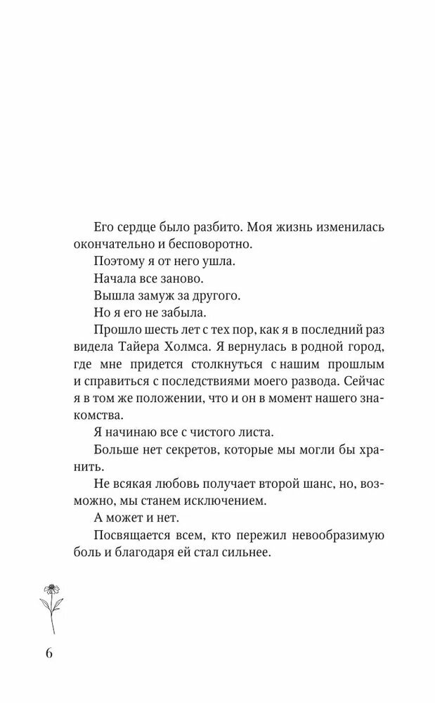 Его сердце было разбито. Моя жизнь изменилась окончательно и бесповоротно. Прошло шесть лет с тех пор, как я в последний раз видела Тайера Холмса. Случившееся навсегда развело наши пути. Мне пришлось собирать себя по кусочкам: новый мужчина, новый город, новая жизнь. Если бы все было так просто. Я вернулась домой, где мне предстоит попрощаться с матерью и разобраться с последствиями моего развода. И не думать о Майере. Ни в коем случае не думать о нем. Вот только. Может ли старая любовь возродиться из пепла? "Иногда рядом с нами есть кто-то, ради кого мы должны быть сильными, тот, кто в нас очень нуждается".