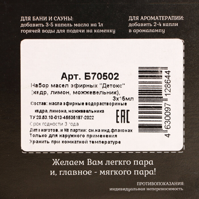 Оживите ваши банные ритуалы с нашим набором эфирных масел Детокс. В комплекте три флакона по 15 мл с ароматами кедра, лимона и можжевельника.