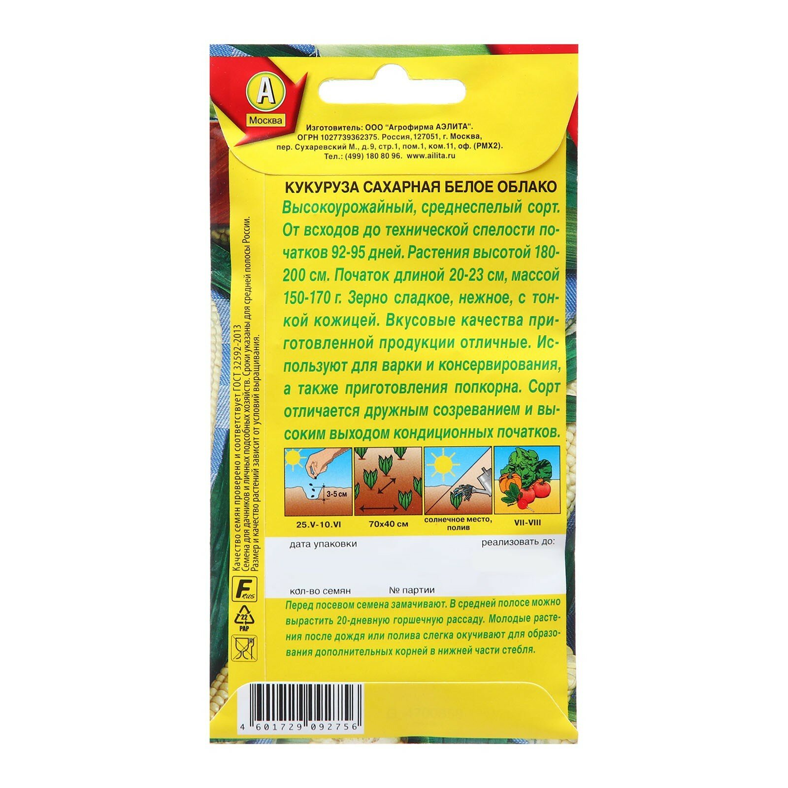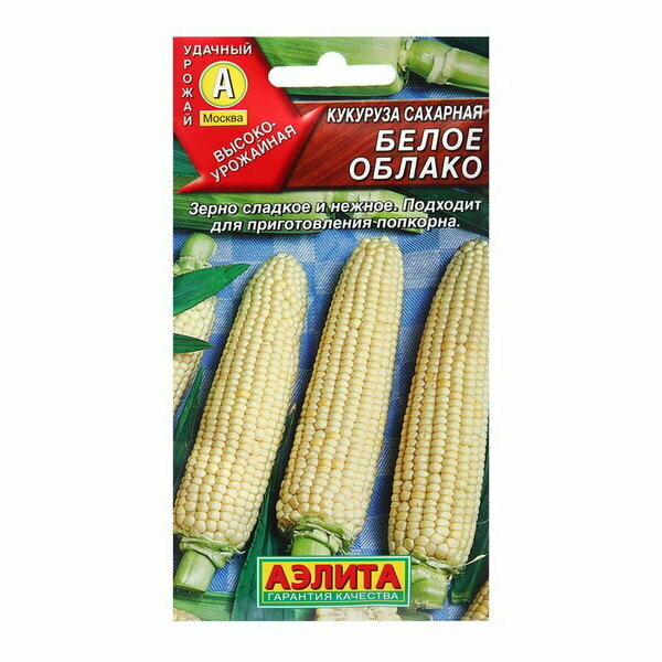**Семена овощей Аэлита кукуруза сахарная Белое облако** — это сорт кукурузы, который отличается своими крупными и сладкими зернами. Был выведен в России и адаптирован для выращивания в различных климатических условиях. Кукуруза «Белое облако» имеет высоту около 1,5-2 метров и может давать до 4 початков на растение. Зерна этой кукурузы имеют белый цвет и могут достигать размера до 2 см в длину. Вкус зерен сладкий и мягкий, что делает их идеальными для употребления в свежем виде, варки или консервирования.