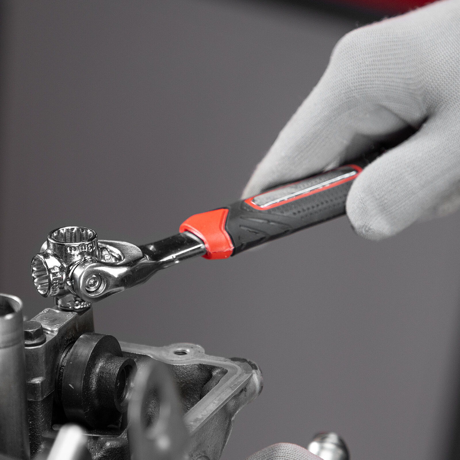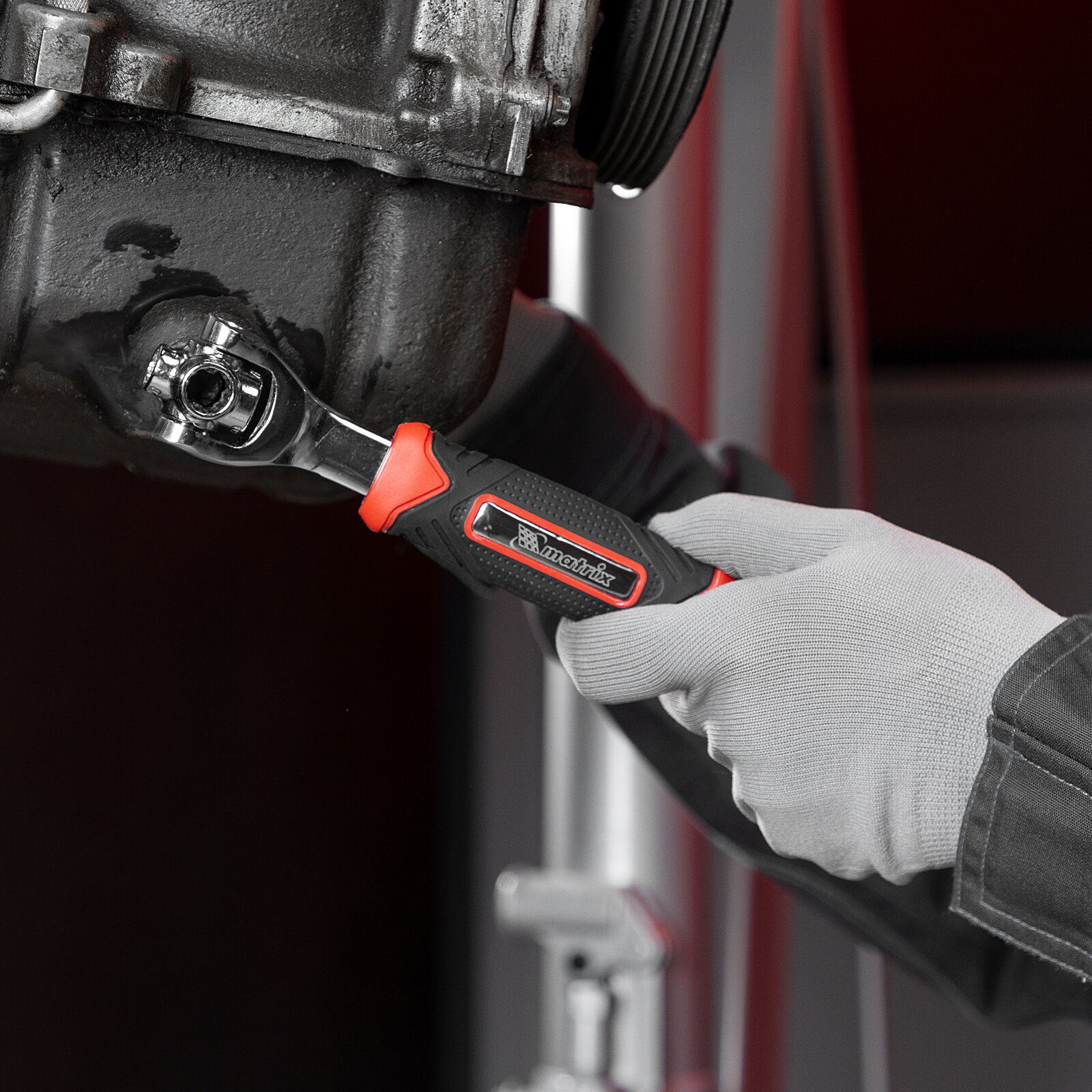 Ключ универсальный 48 в 1 Matrix 14999 из стали CrV имеет 8 размеров головок: 8 мм, 10 мм, 11 мм, 13 мм, 14 мм, 16 мм, 17 мм, 19 мм. Подходит для различных профилей: 6-гранных, 8-гранных, 12-гранных, Square, Torx, Spline. Предназначен для монтажа и демонтажа болтовых соединений. Поворот головки на 360° и угол наклона 45° позволяют работать в труднодоступных местах. Конструкция головки позволяет закручивать и откручивать крепежи на высоких шпильках. ПреимуществаВысококачественное исполнение — ключ изготовлен из износостойкой хромованадиевой стали. Устойчивость к высоким нагрузкам — твердость рабочей части составляет 40-45 HRC. Защита от коррозии — на инструмент нанесено зеркальное хромовое покрытие. Комфортная эксплуатация — благодаря прорезиненной рукоятке ключ не выскальзывает рук.