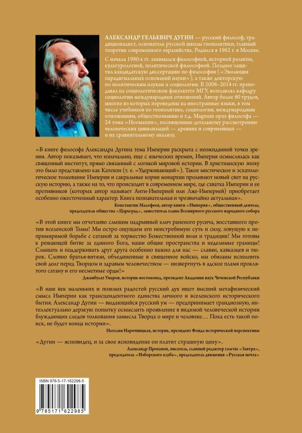 Книга русского философа Александра Дугина представляет собой фундаментальное исследование идеи Империи – в онтологическом, историческом, религиозном, мистическом, эсхатологическом и геополитическом смыслах. Автор подробно разбирает сакральную природу Империи как духовного института в самых различных цивилизациях – древних и современных. Суть драматических современных событий предстает в книге как финальное столкновение Империи и Анти-Империи. Предназначена для широкого круга читателей.
