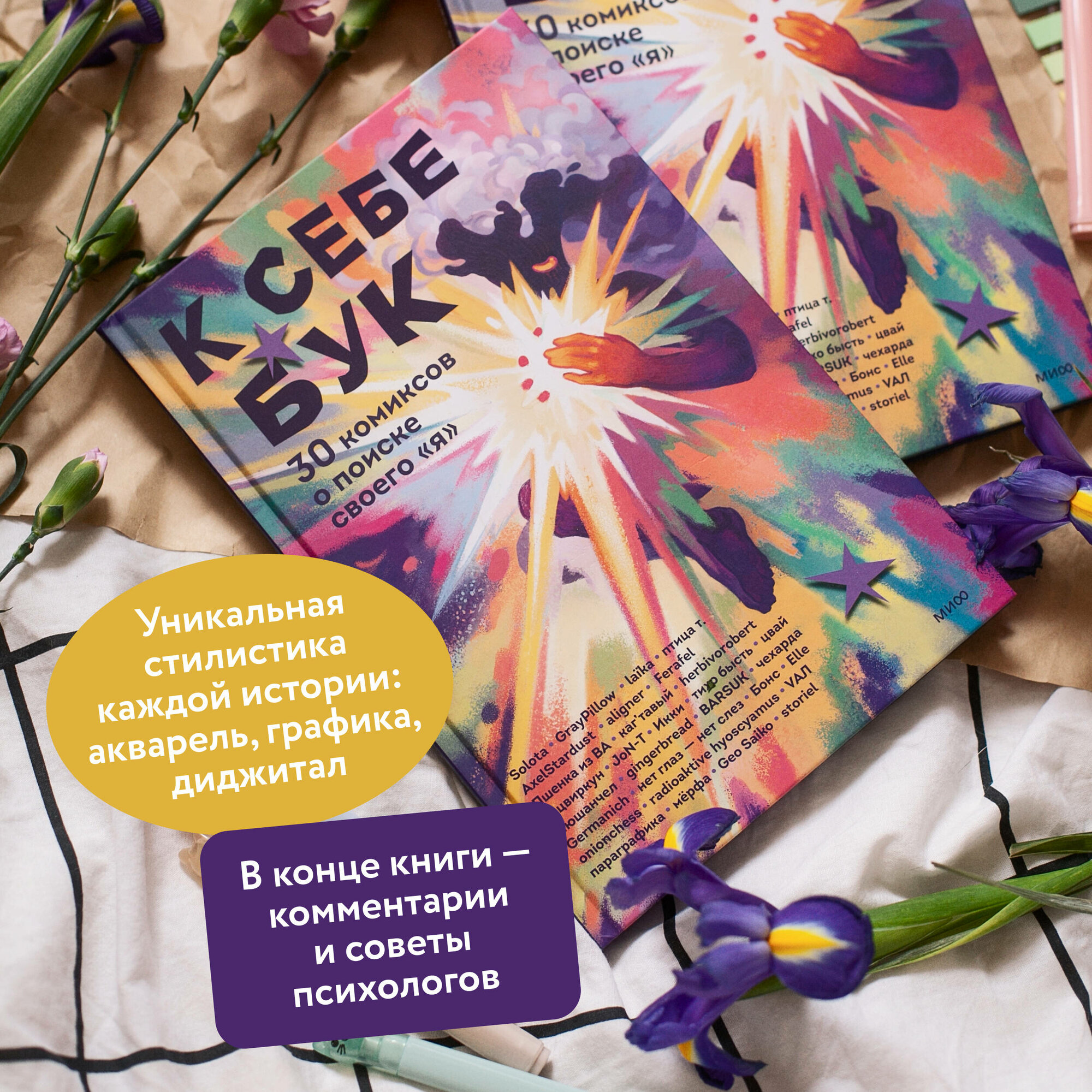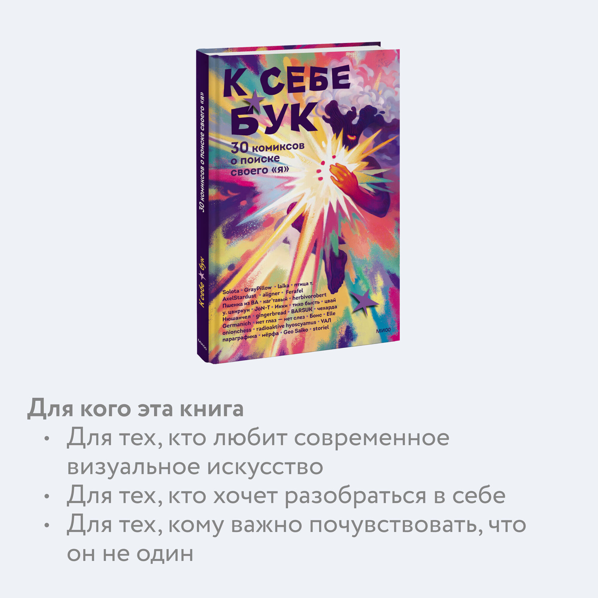 К себе бук. 30 комиксов о поиске своего «я» борьбе со страхами и любви к себе (Икки, Нюшанчел, Solota, GrayPillow, laïka, птица т., AxelStardust, aligner, Ferafel, JoN-T, у. цвиркун, herbivorobert, каг’тавый, Пшенка из ВА, тихо бысть, Цвай, gingerbread, BARSUK, чехарда, Germanich, нет глаз - нет слез, Бонс, Elle, onionchess, radioaktive hyoscyamus, VAЛ, параграфика, мёрфа, Geo Saiko, storiel); Манн, Иванов и Фербер, 2024