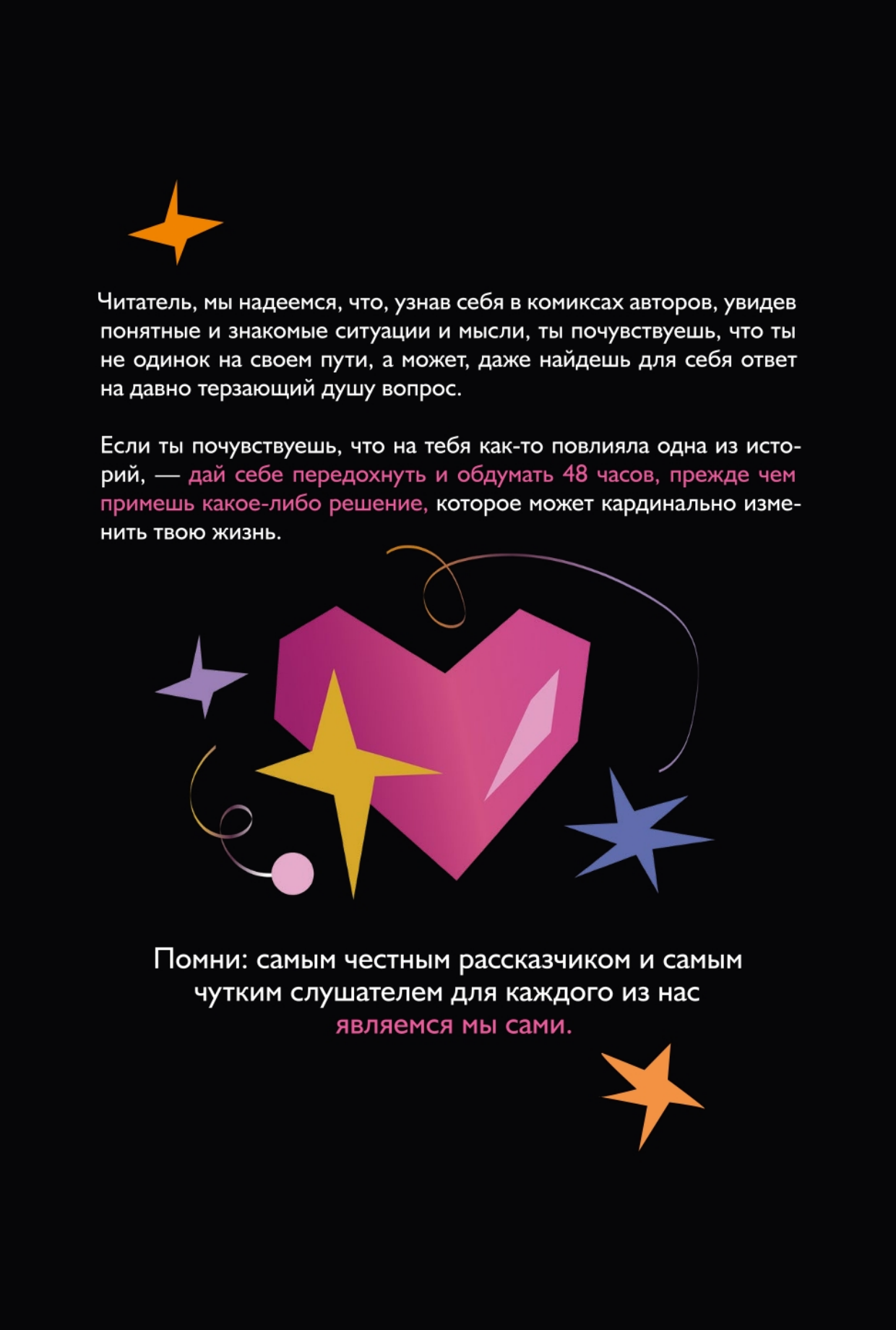 Сборник из 30 комиксов от 30 современных русскоязычных художников. В каждой истории авторы отвечают на личные вопросы о своем жизненном опыте и творческом пути, а главное — о принятии себя. Также в книге содержатся комментарии и советы психологов.