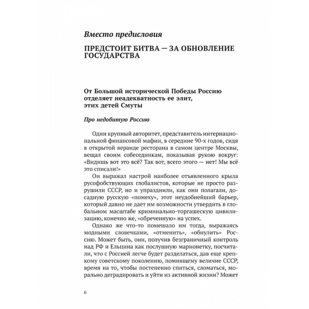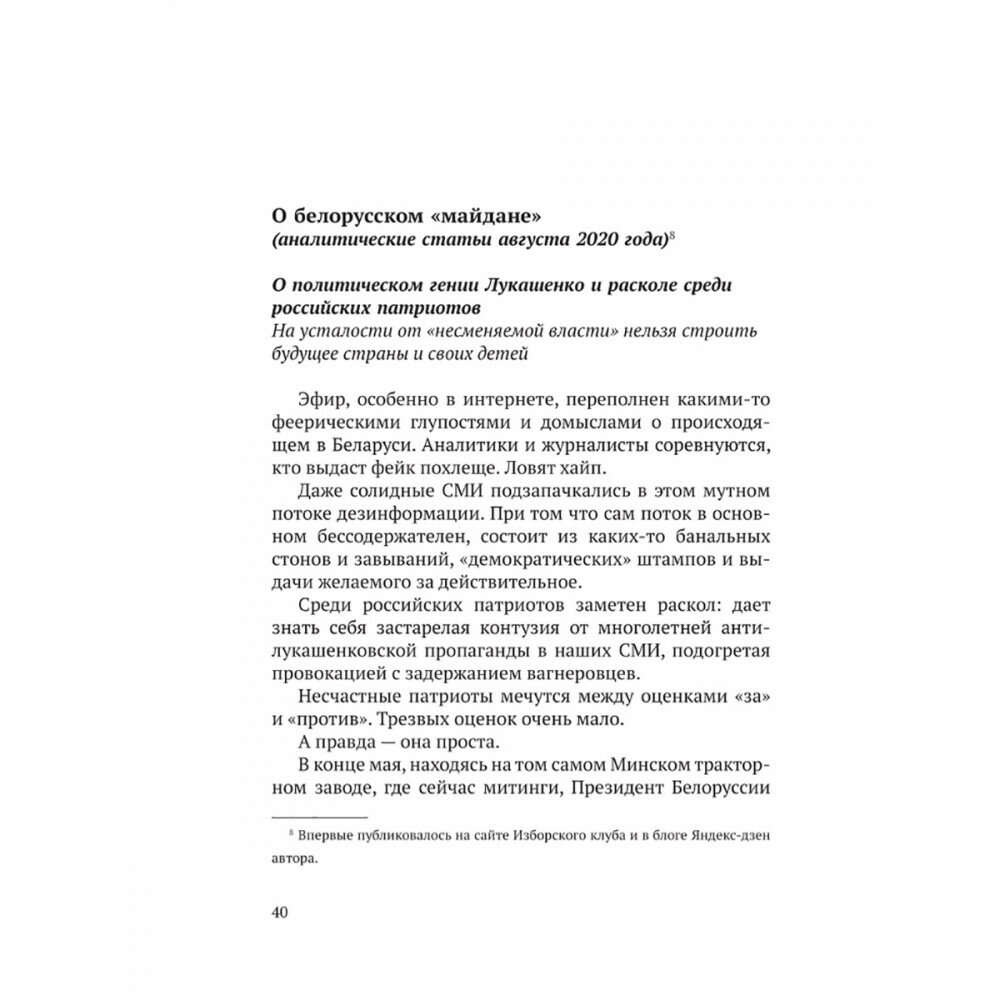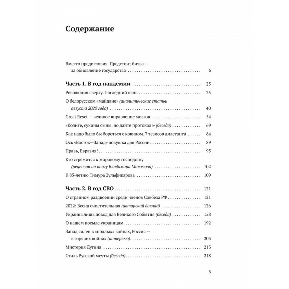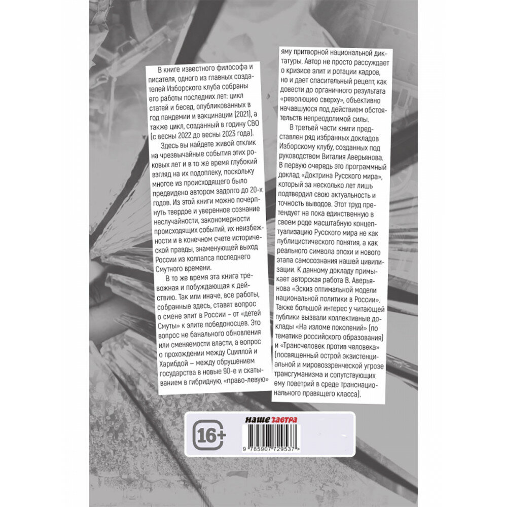 В книге известного философа и писателя, одного из главных создателей Изборского клуба собраны его работы последних лет: цикл статей и бесед, опубликованных в год пандемии и вакцинации (2021), а также цикл, созданный в годину СВО (с весны 2022 до весны 2023 года). Здесь вы найдете живой отклик на чрезвычайные события этих роковых лет и в то же время глубокий взгляд на их подоплеку, поскольку многое из происходящего было предвидено автором задолго до 20-х годов. Из этой книги можно почерпнуть твердое и уверенное сознание неслучайности, закономерности этих событий, их неизбежности и в конечном счете исторической правды, знаменующей выход России из коллапса последнего Смутного времени.