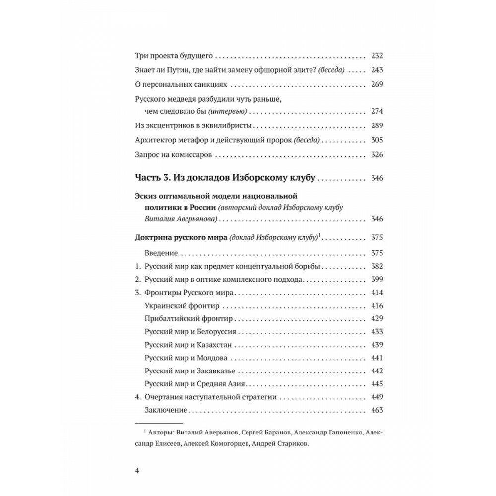 В третьей части книги представлен ряд избранных докладов Изборскому клубу, созданных под руководством Виталия Аверьянова. В первую очередь это программный доклад "Доктрина Русского мира", который за несколько лет лишь подтвердил свою актуальность и точность выводов. Этот труд претендует на пока единственную в своем роде масштабную концептуализацию Русского мира не как публицистического понятия, а как реального символа эпохи и нового этапа самосознания нашей цивилизации. К данному докладу примыкает авторская работа В. Аверьянова "Эскиз оптимальной модели национальной политики в России". Также большой интерес у читающей публики вызвали коллективные доклады "На изломе поколений" (по тематике российского образования) и "Трансчеловек против человека" (посвященный острой экзистенциальной и мировоззренческой угрозе трансгуманизма и сопутствующих ему поветрий в среде транснационального правящего класса).
