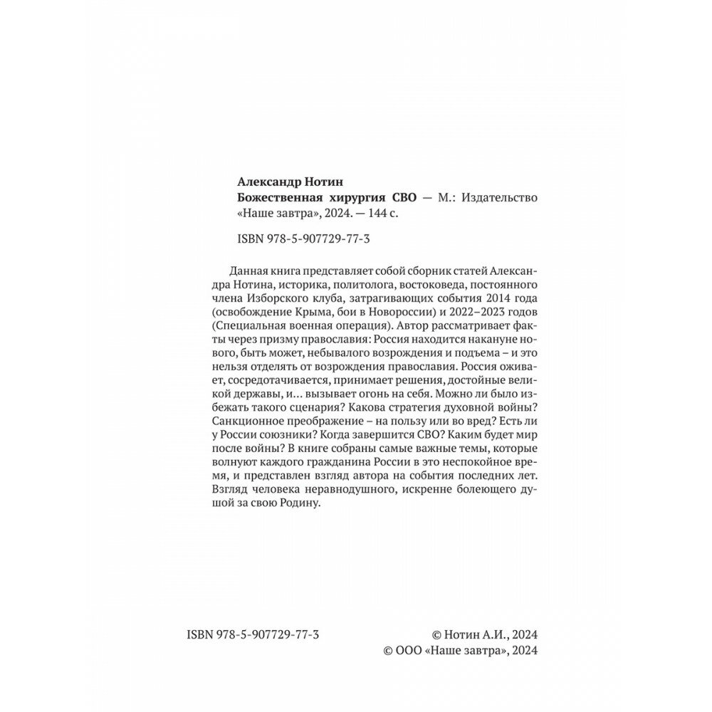 Данная книга представляет собой сборник статей Александра Нотина, историка, политолога, востоковеда, постоянного члена Изборского клуба, затрагивающих события 2014 года (освобождение Крыма, бои в Новороссии) и 2022–2023 годов (Специальная военная операция). Автор рассматривает факты через призму православия: Россия находится накануне нового, быть может, небывалого возрождения и подъема – и это нельзя отделять от возрождения православия. Россия оживает, сосредотачивается, принимает решения, достойные великой державы, и… вызывает огонь на себя. Можно ли было избежать такого сценария? Какова стратегия духовной войны?