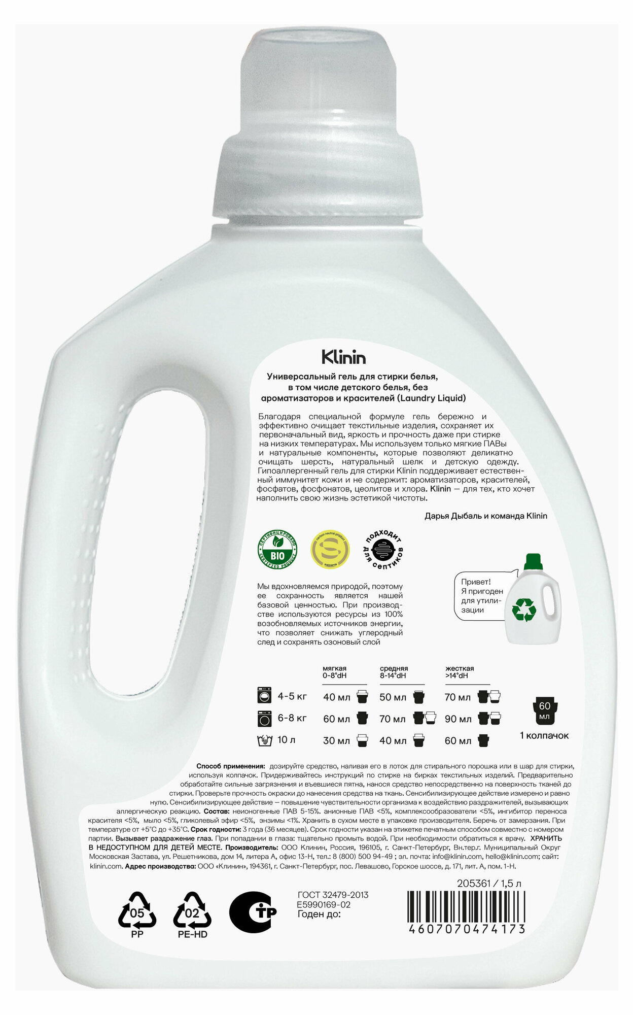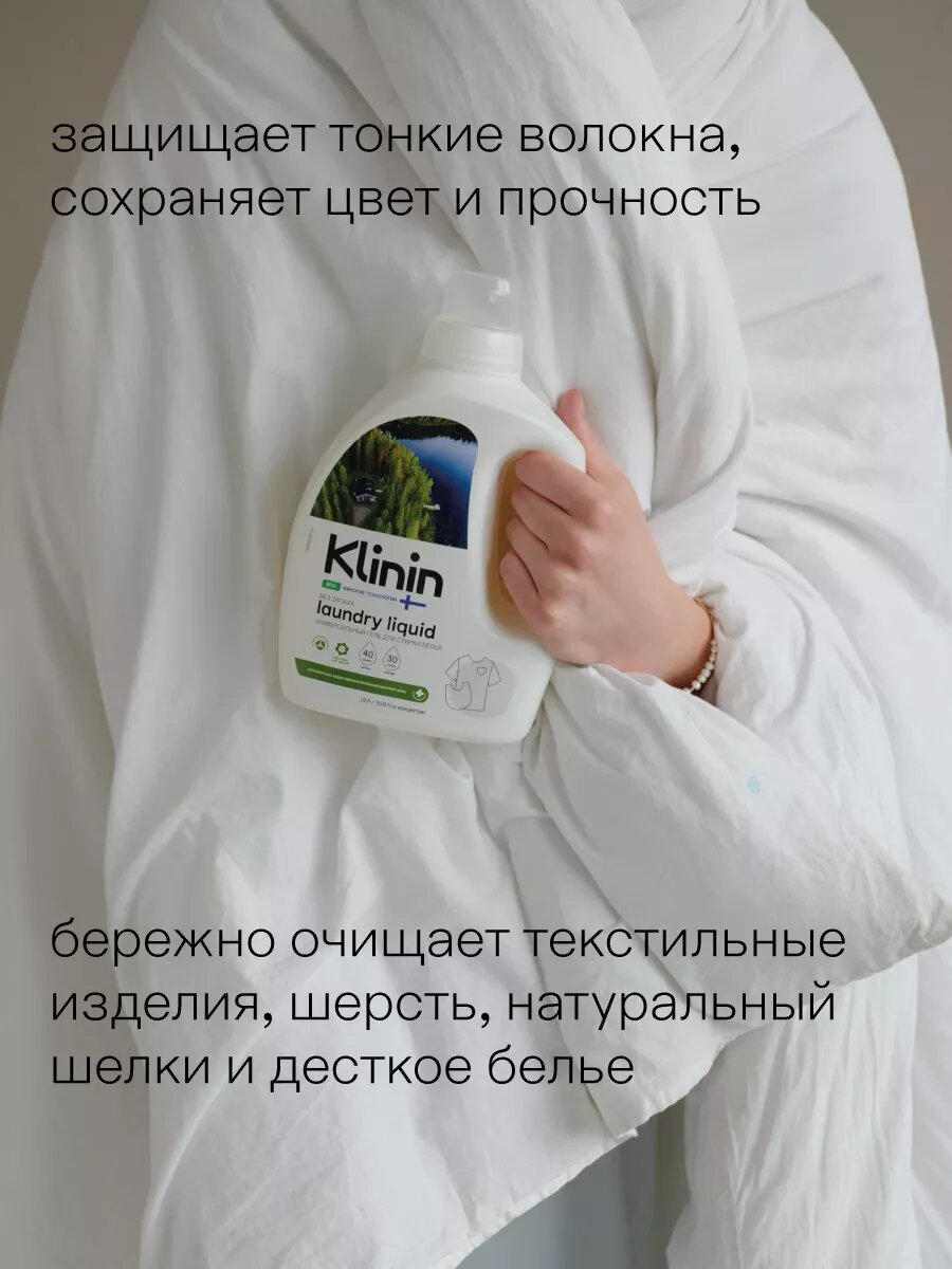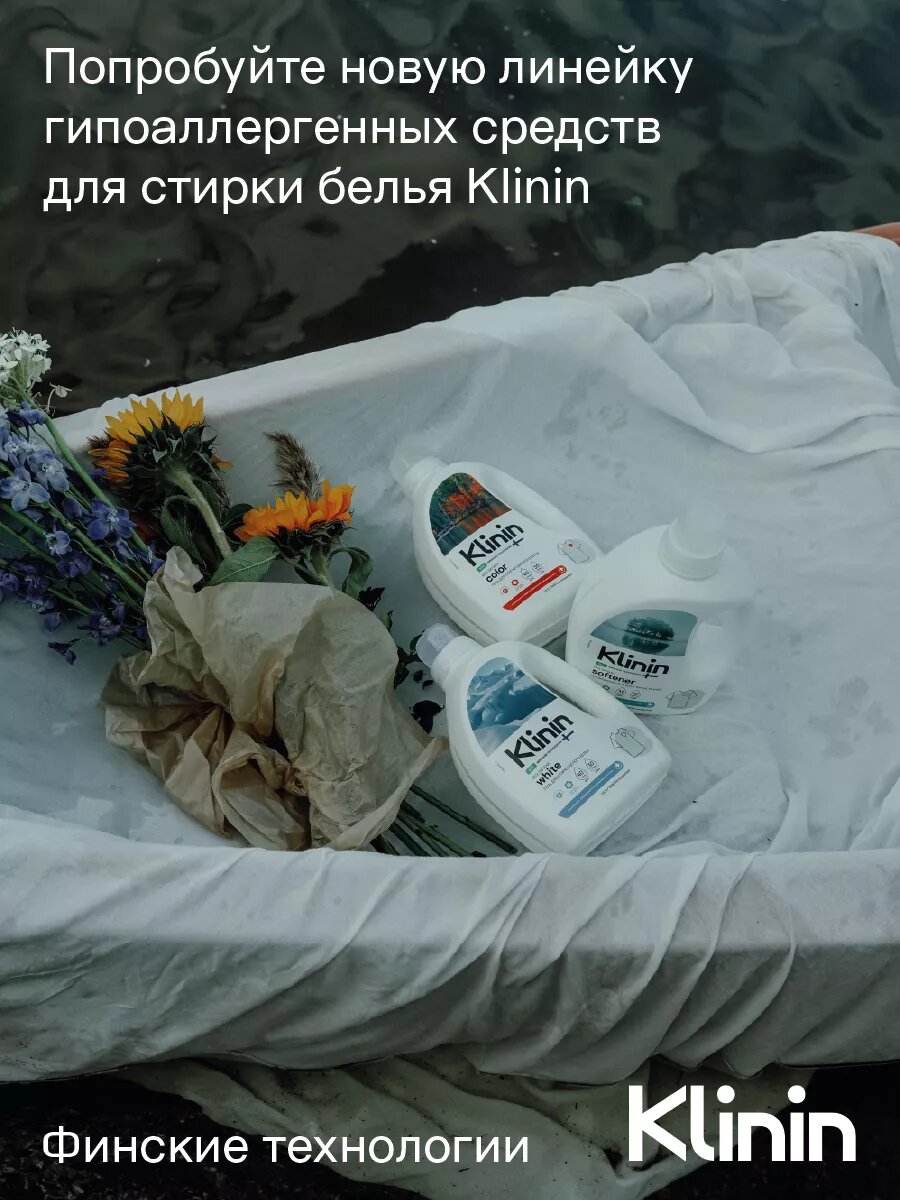 Гипоаллергенный гель для стирки всех типов тканей Klinin благодаря специальной формуле бережно и эффективно очищает текстильные изделия, сохраняет их первоначальный вид, яркость и прочность даже при стирке на низких температурах. Экологичный гель подходит для машинной и ручной стирки. Мы используем только мягкие ПАВы и натуральные компоненты, которые позволяют деликатно очищать шерсть, натуральный шелк и детскую одежду. Универсальный гель для стирки белья Klinin поддерживает естественный иммунитет кожи. Жидкое средство для стирки белья экологически безопасно и не содержит красителей, ароматизаторов, фосфатов, фосфонатов, цеолитов и хлора. Экологичное средство подходит для детской одежды и безопасно для септических установок. Биоразлагаемый гель имеет свидетельство о государственной регистрации, паспорт безопасности, согласно которым соответствует единым санитарно-эпидемиологическим и гигиеническим требованиям к товарам, а также сертификат соответствия требованиям биологической безопасности - так мы проявляем ответственность перед вами. Мы за разумное потребление, поэтому упаковка выполнена из перерабатываемого материала. Рекомендуем сдавать пустую чистую тару в пункт приема вторсырья. Klinin для тех, кто хочет наполнить свою жизнь эстетикой чистоты.