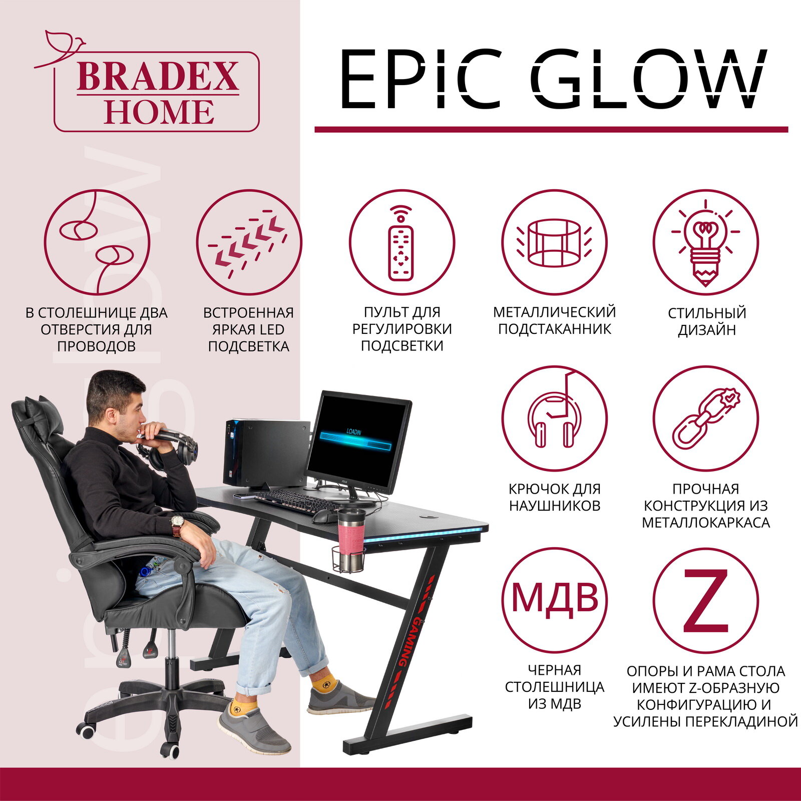 Тем, кто основательно подходит к выбору мебели и компьютерных девайсов, стоит обратить внимание на компьютерный стол EPIC GLOW. В нем есть все, что нужно геймеру, и при этом он хорошо впишется в интерьер квартиры, студии или офиса. Его преимущества это:• прочная и удобная конструкция: столешница 120*60 см и толщиной 2,5 см прослужит долго и выдержит установку любого оборудования (рассчитана на нагрузку до 200 кг). Опоры и рама стола имеют Z-образную конфигурацию и усилены перекладиной;• современный дизайн: немаркое и стойкое покрытие «под карбон», черный цвет ножек и столешницы смотрятся стильно и лаконично. Яркая LED подсветка создает динамичную атмосферу, легко управляется с помощью пульта дистанционного управления.• отличная эргономика и дополнительные возможности: два отверстия для проводов позволяют удобно подключить оборудование, а даже самые большие профессиональные наушники не будут мешать вам на столе — для них есть специальный крючок. Для стакана с кофе или другим напитком есть специальный подстаканник.EPIC GLOW надёжен, оснащён всем необходимым и практически универсален по форме и дизайну.