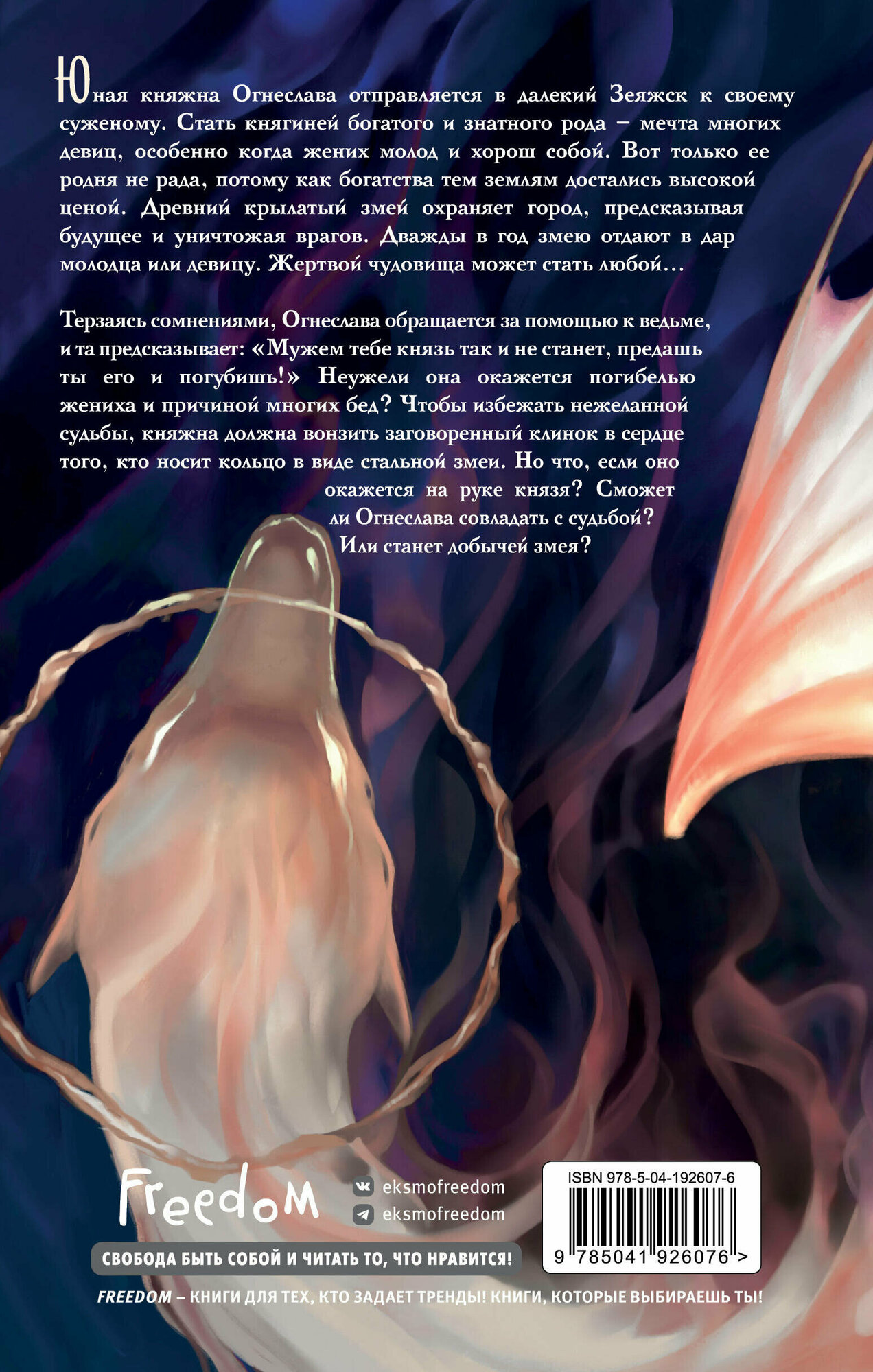 «Огнеслава» - многообещающий дебют Марины Гамаюн! Романтическая фэнтези-дилогия на основе славянского фольклора, в котором отсылки к сказкам и легендам переплетаются с захватывающей самобытной историей. Роман занял пятую строчку в рейтинге славянского фэнтези на портале Литмаркет! Читателя ждет мир, полный колдовства и магических существ, а также борьба за власть, интриги, тайны и, конечно же, любовь! Искренняя, чистая и несокрушимая! Юная княжна Огнеслава отправляется в далекий Зеяжск к своему суженому. Стать княгиней богатого и знатного рода - мечта многих девиц, особенно, когда жених молод и хорош собой. Вот только ее родня не рада, потому как богатства тем землям достались высокой ценой. Древний крылатый змей охраняет город, предсказывая будущее и уничтожая врагов. Дважды в год змею отдают в дар молодца или девицу. Жертвой чудовища может стать любой. Терзаясь сомнениями, Огнеслава обращается за помощью к ведьме, и та предсказывает: «Мужем тебе князь так и не станет, предашь ты его и погубишь! » Неужели она окажется погибелью жениха и причиной многих бед? Чтобы избежать нежеланной судьбы, княжна должна вонзить заговоренный клинок в сердце того, кто носит кольцо в виде стальной змеи. Но что, если оно окажется на руке князя? Сможет ли Огнеслава совладать с судьбой? Или станет добычей змея?